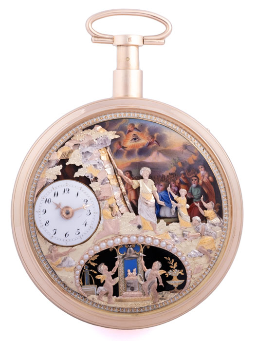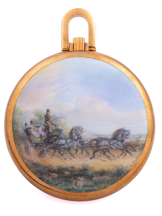 A very fine, unique, fresh to the market, important, 18k yellow gold, manual wind pocket watch with enamel by Suzanne Rohr, original painting by Johannes Vermeer (circa 1660)