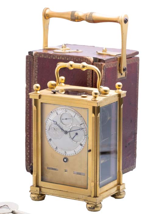 An exceptional and extremely rare, large, gilt bronze, manual wind multi-piece case, “Empire”, glazed on four sides and the top, four Doric type columns, one on each corner, hinged front and back doors for access to the dial and the movement, engine-turned top with glazed center, pivoted handle hinges, four gilt feet.Â