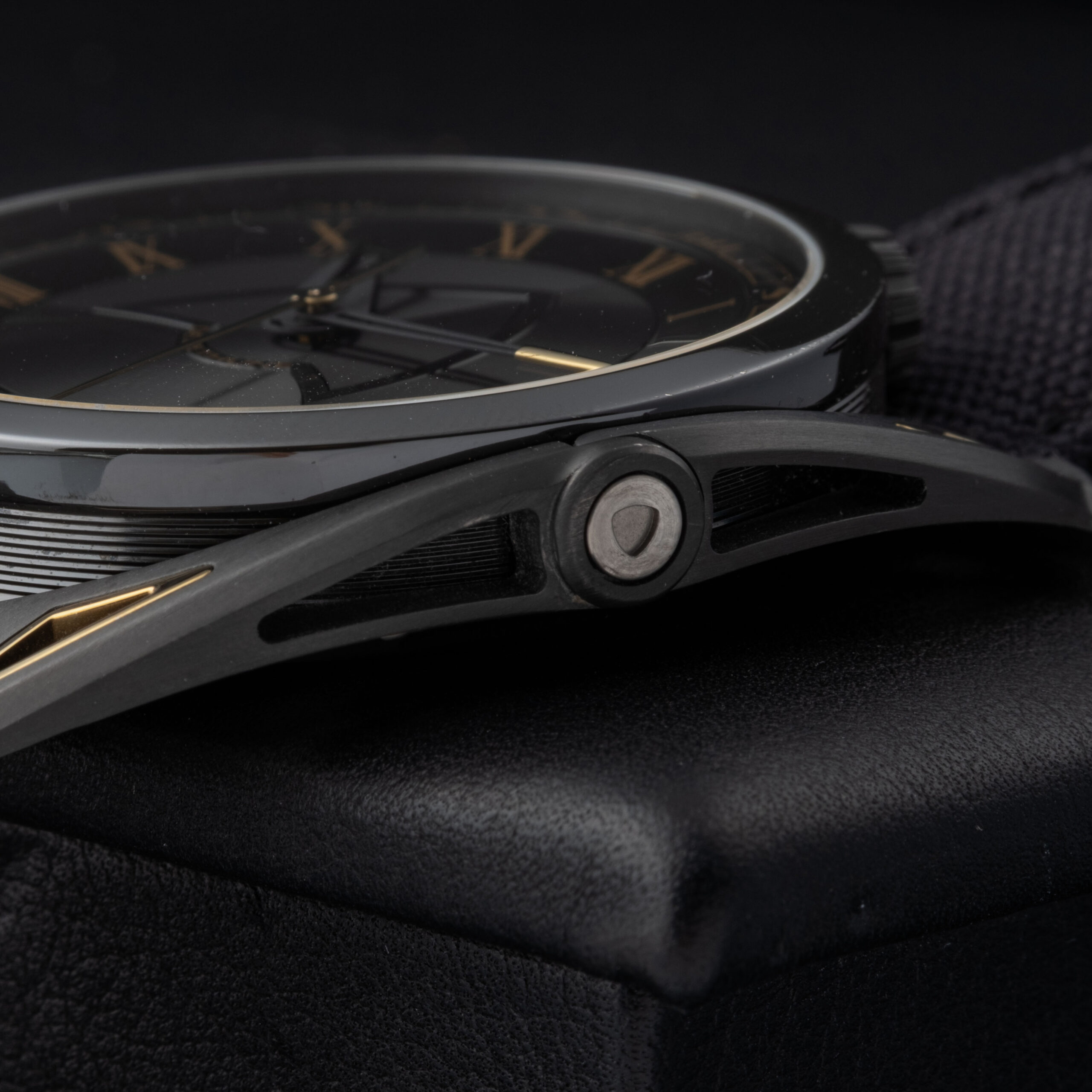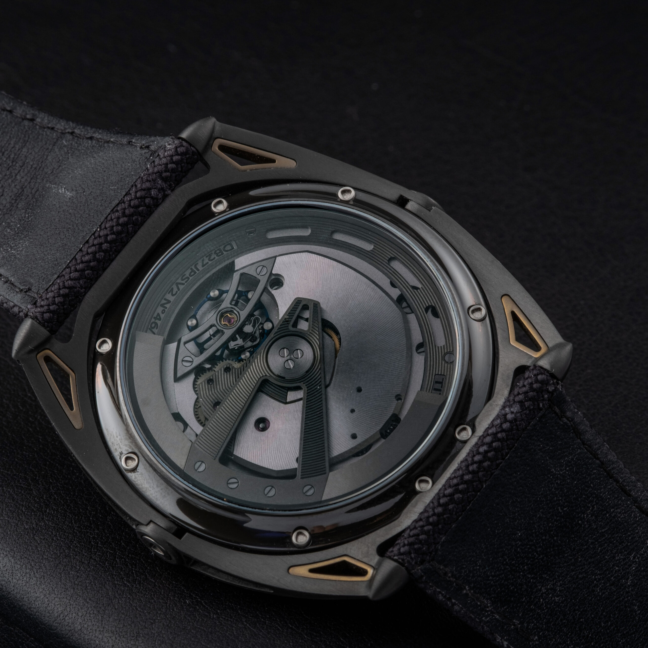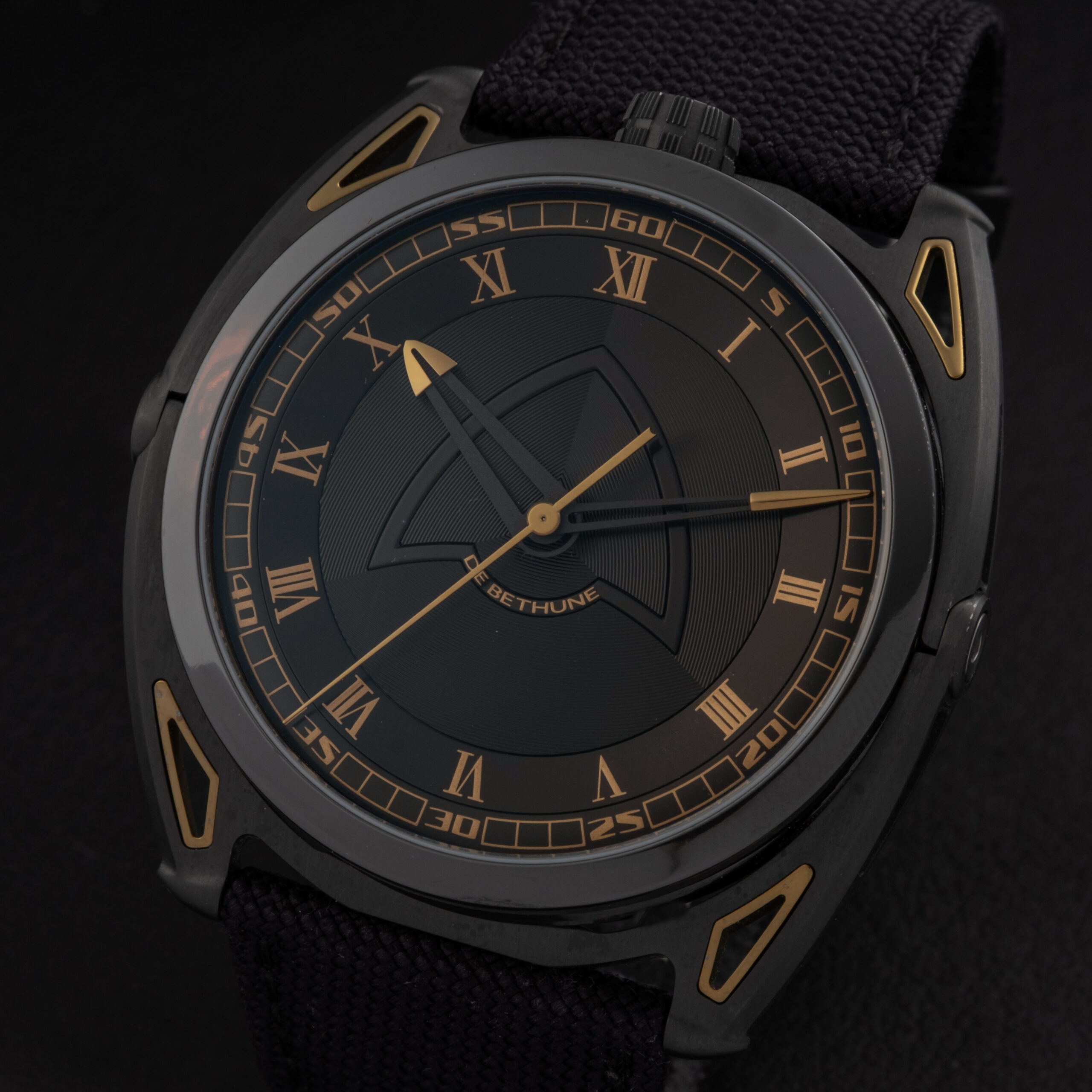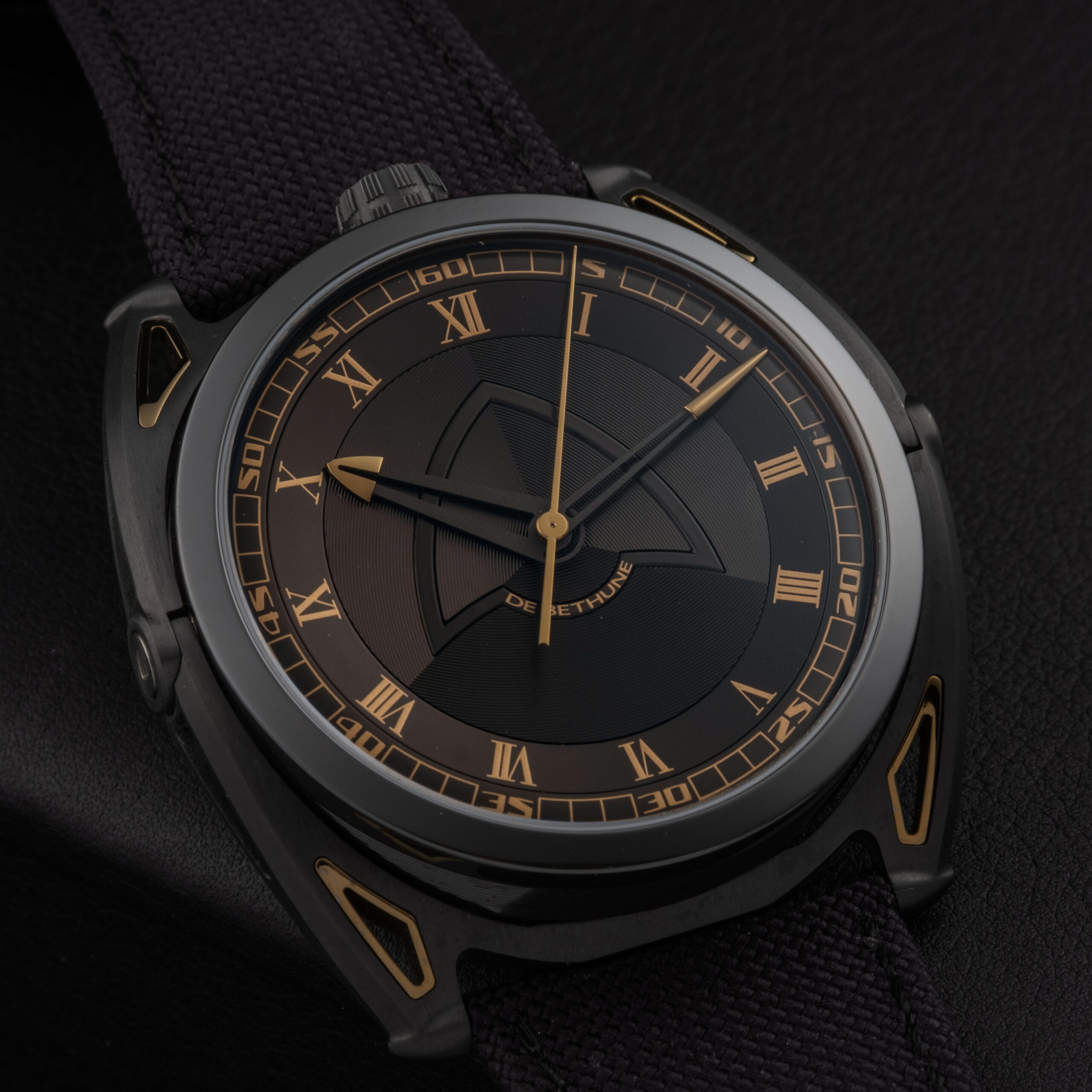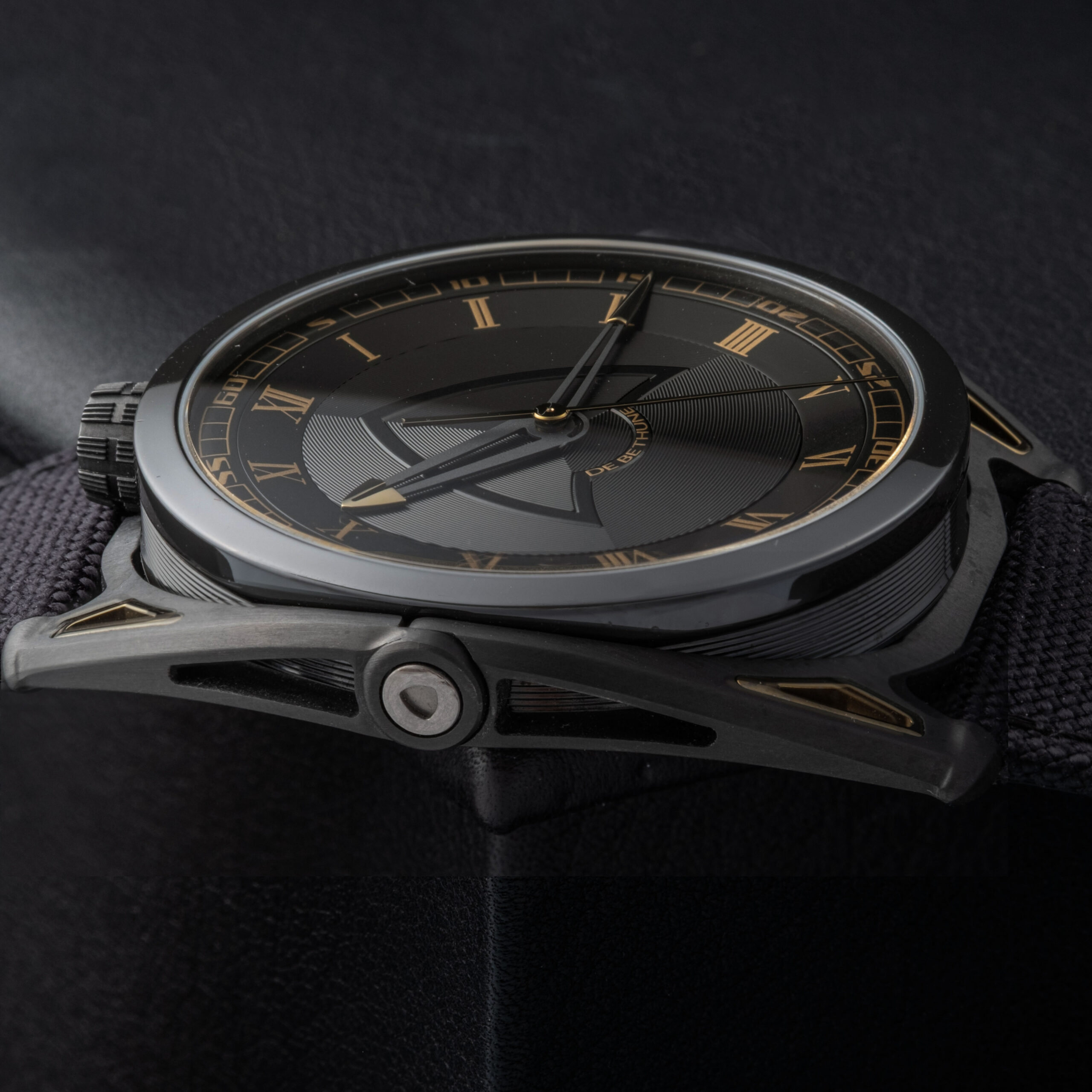The dial features De Bethune’s signature multi-level construction, combining concentric microlight patterns with a central delta-shaped bridge motif. The black and anthracite tones are enhanced by warm gold Roman numerals and matching hands, creating a refined yet highly contemporary visual identity. The minute track is precisely executed, maintaining perfect legibility while reinforcing the technical aesthetic of the piece. The overall dial remains flawless, with no marks or imperfections.