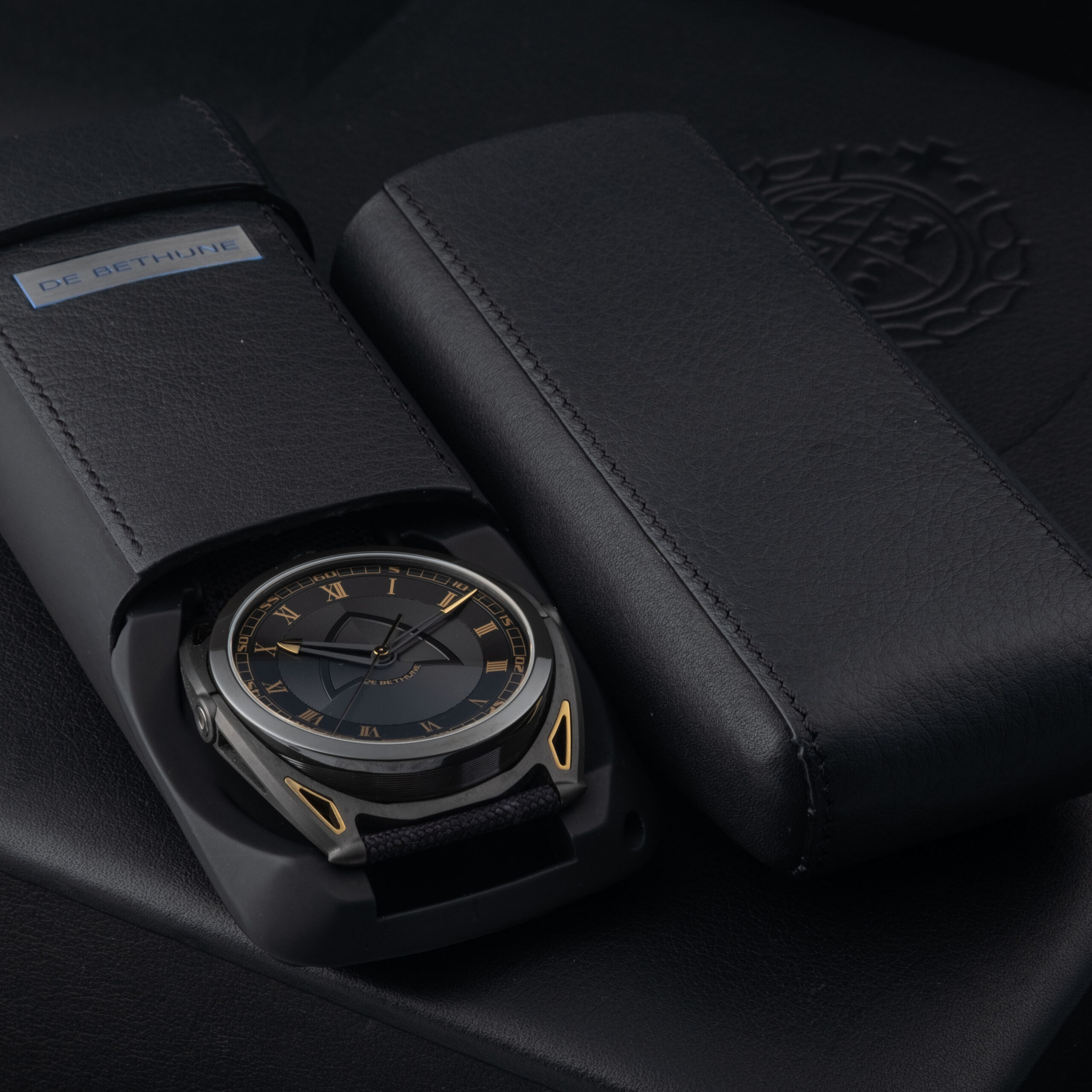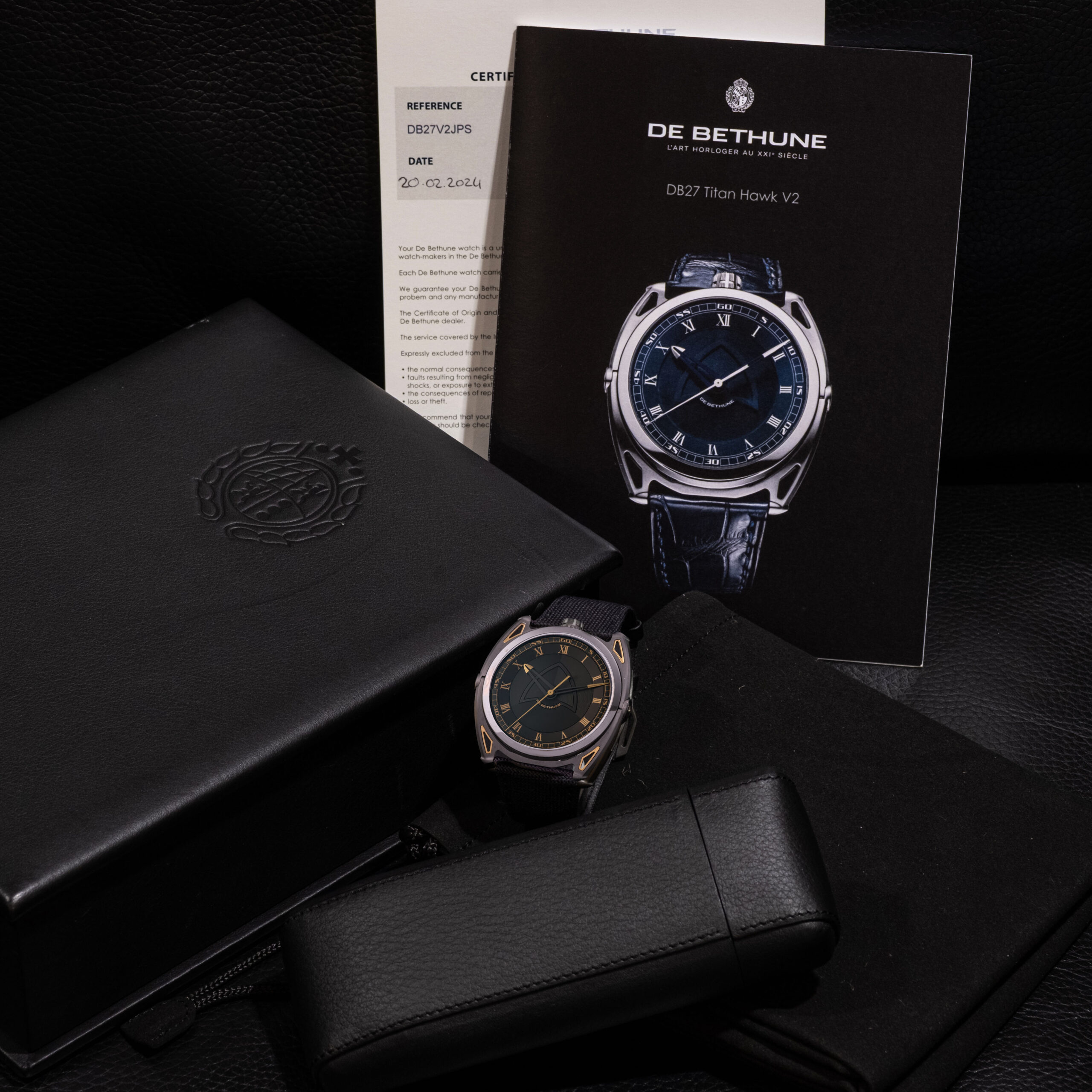 This example, delivered in 2024, is offered as a complete full set including its original box, certificate, and accessories. The watch presents in virtually unworn condition, showcasing the sharp execution and finishing quality characteristic of De Bethune’s independent manufacture. The black zirconium case offers exceptional lightness and durability, while its subtle sheen contrasts elegantly with the polished gold-toned accents integrated into the lugs.