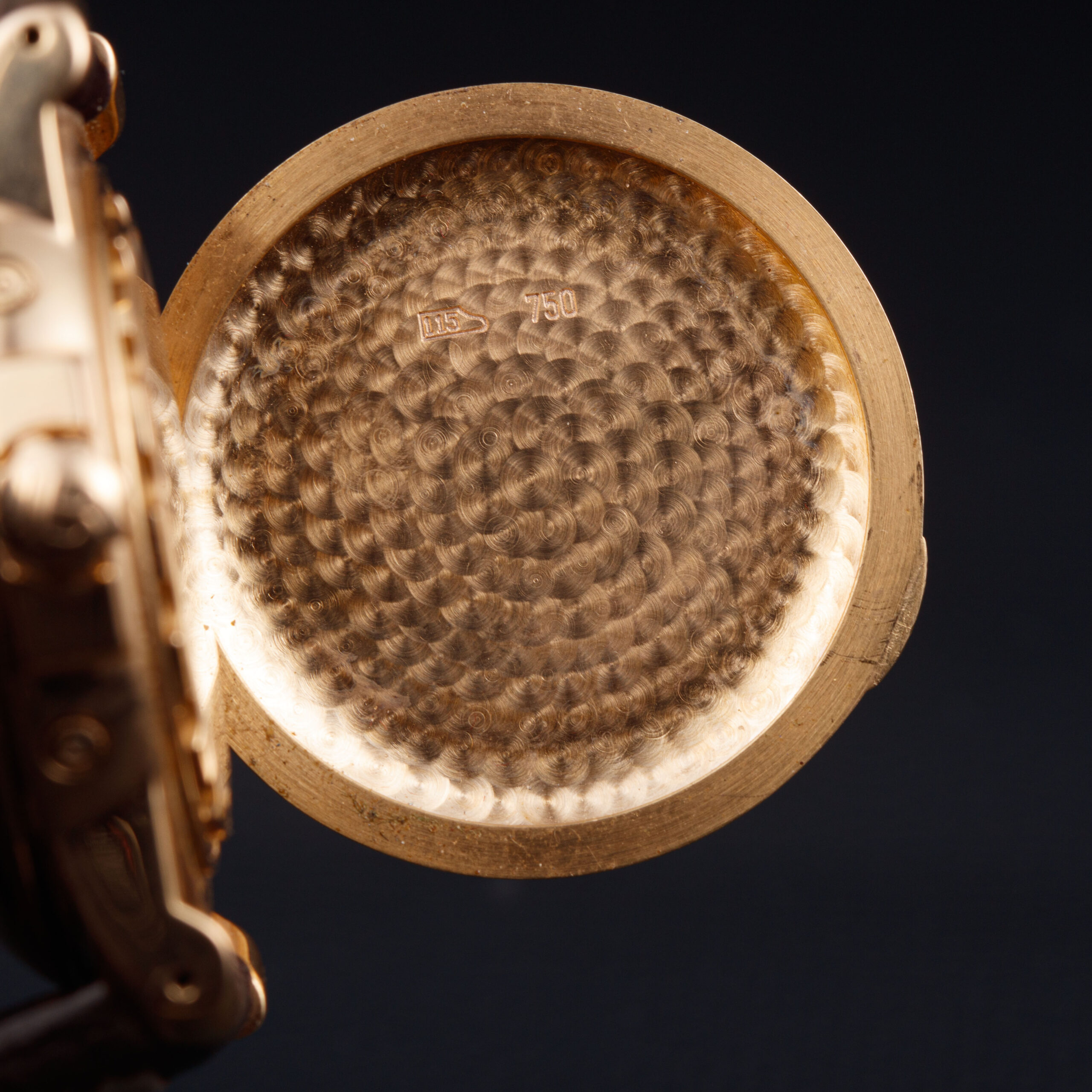 The substantial round case is crafted in 18k pink gold and distinguished by its hinged hunter-style cuvette, an elegant and technically demanding construction rarely seen in modern watchmaking. The warm tone of the gold enhances the sculptural profile of the Léman case, while the polished surfaces display a pleasing, honest patina consistent with careful wear. The hinged cover protects the crystal and adds a ceremonial quality to the act of reading the time, recalling classical pocket-watch traditions reinterpreted for the wrist.