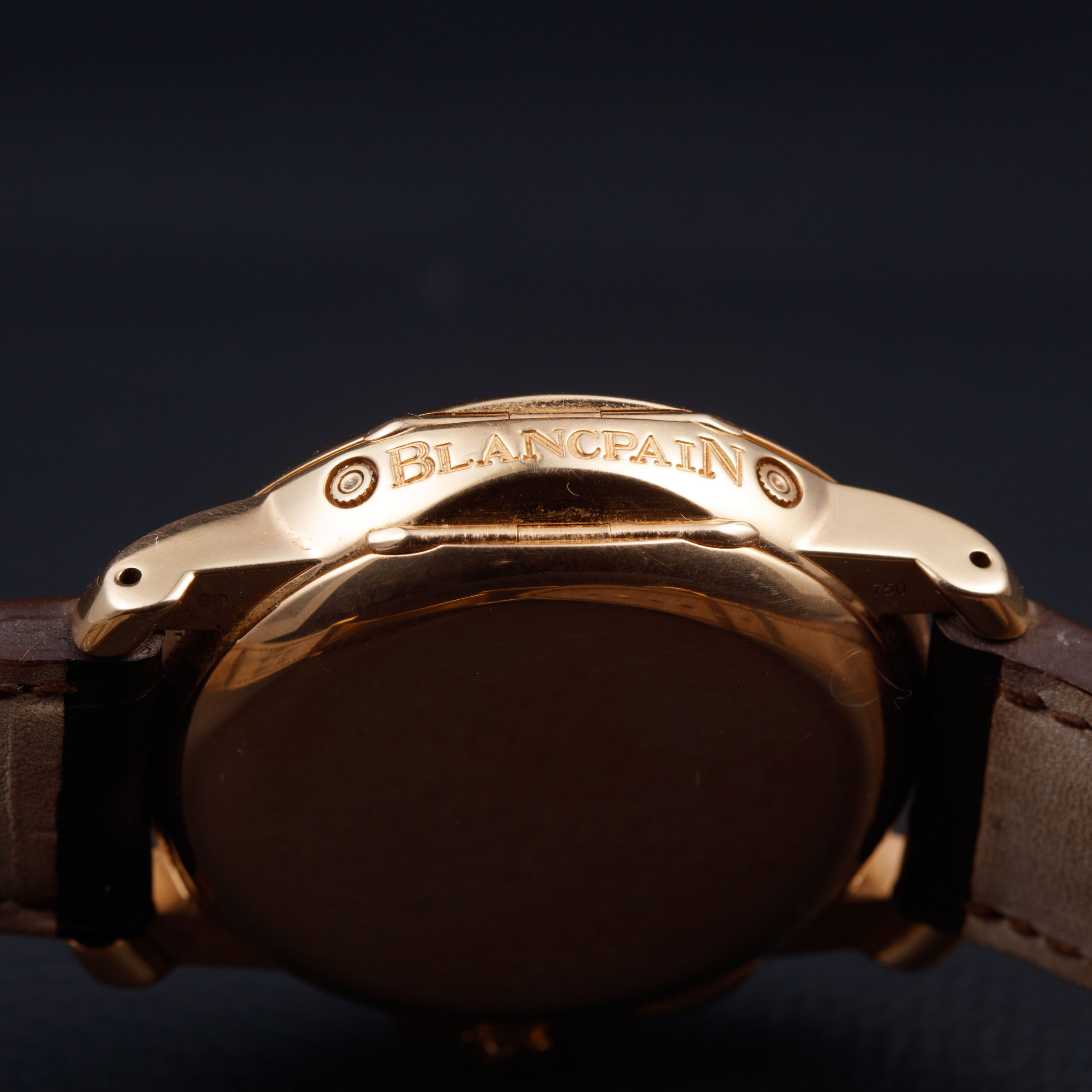 Housed within is an in-house automatic movement, visible through the sapphire caseback once the hinged cuvette is opened. The caliber is richly finished, featuring a solid gold rotor engraved with the Blancpain name. Combining multiple calendar indications with a moon-phase display, the movement exemplifies Blancpain’s long-standing expertise in traditional high complications and refined mechanical execution.