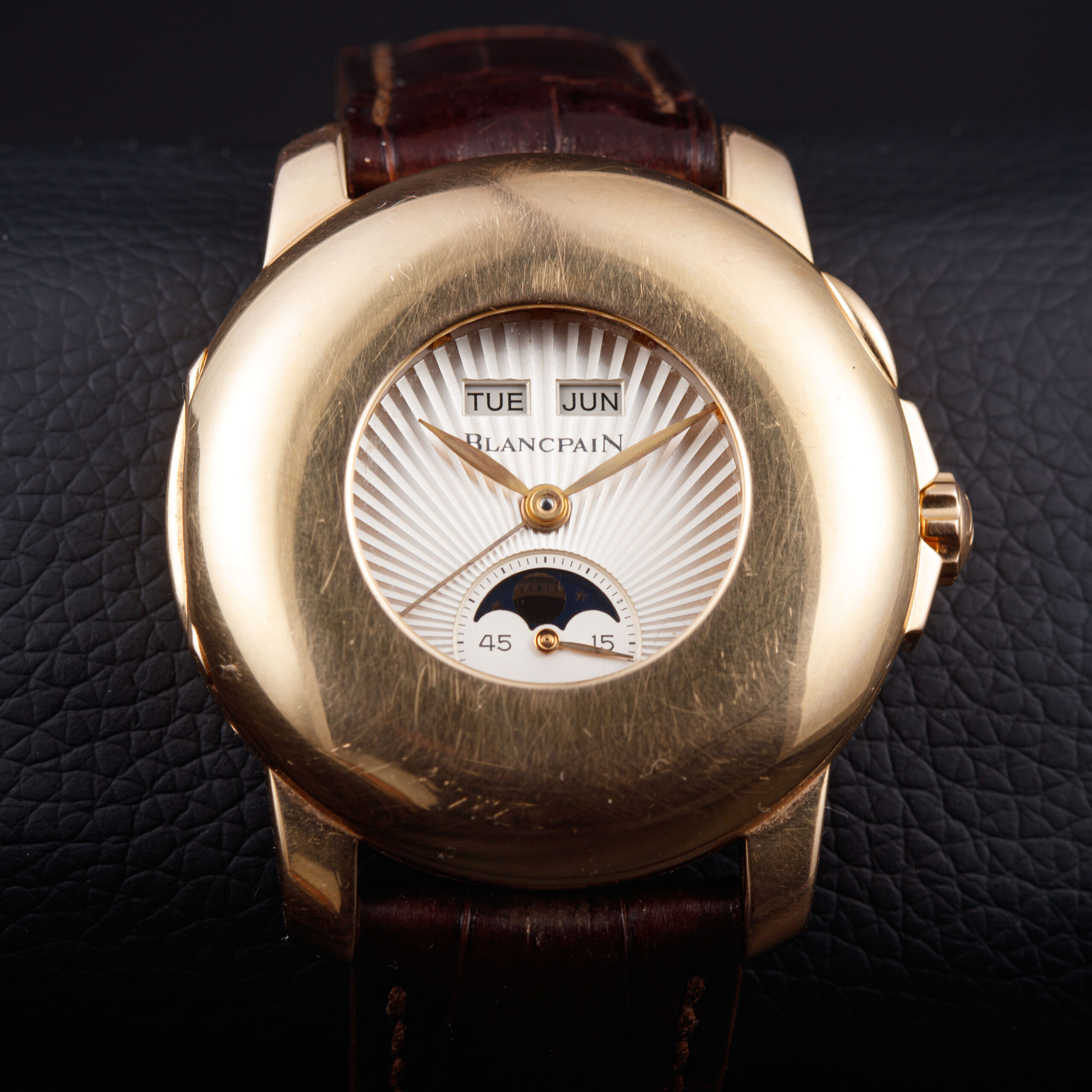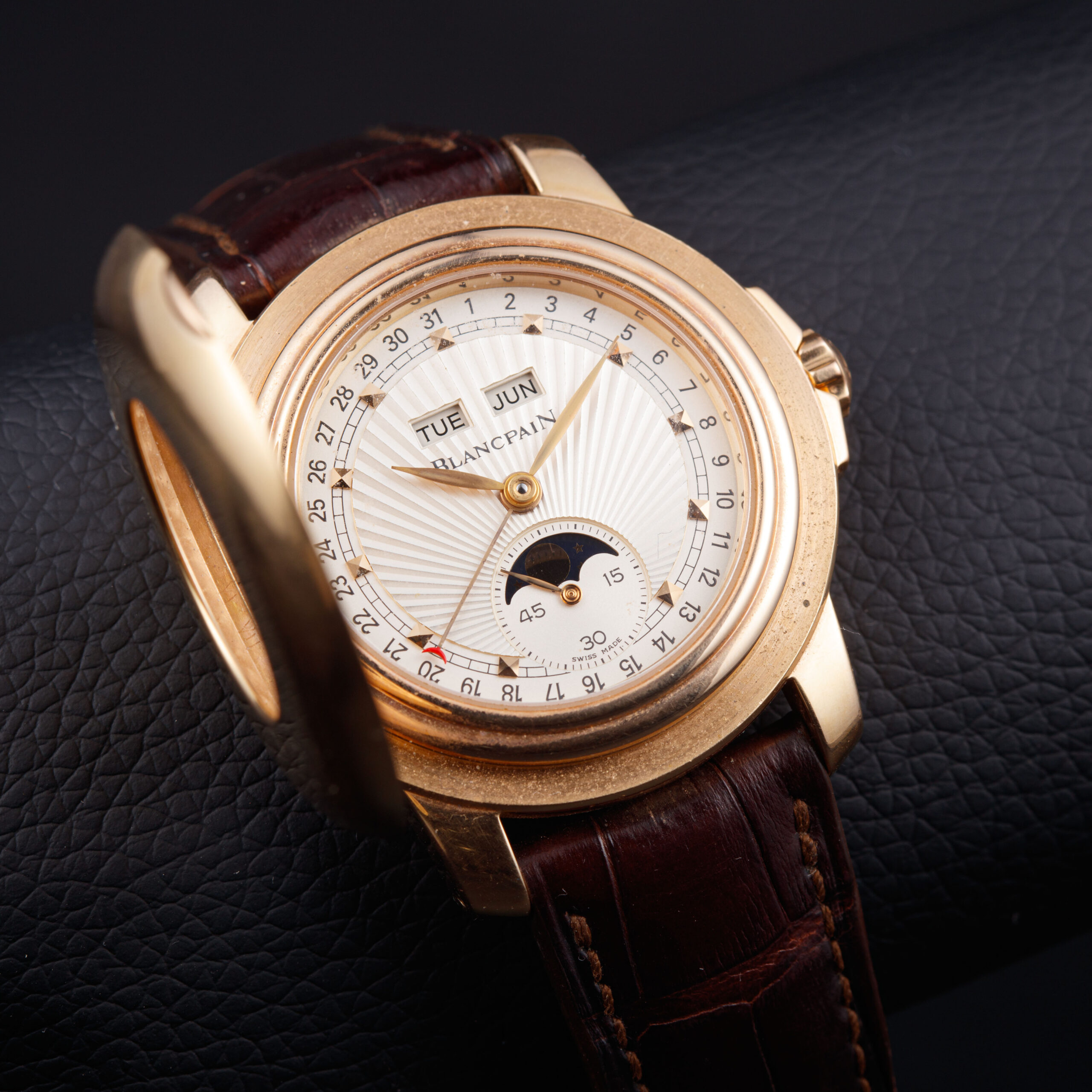The multi-level dial is executed in a finely engraved silvered finish with radiating guilloché, offering depth and visual dynamism. Twin apertures at 12 o’clock display the day and month, while a peripheral date scale with a blued pointer hand encircles the dial. At 6 o’clock, a moon-phase indication is integrated with a subsidiary seconds display, providing a balanced and harmonious layout. Applied gold markers and matching hands complete a composition that is both highly legible and richly detailed, signed “Blancpain” beneath the calendar apertures.