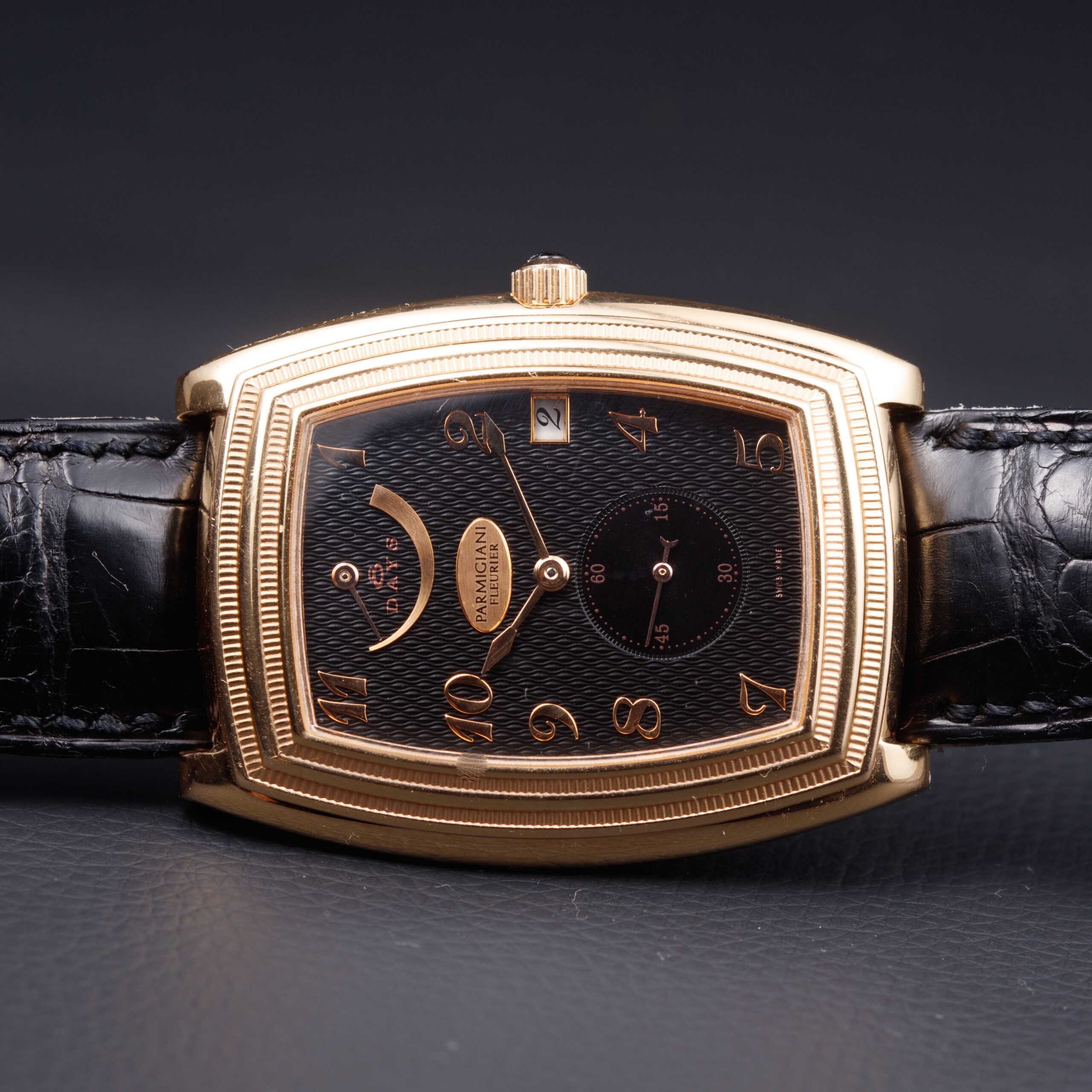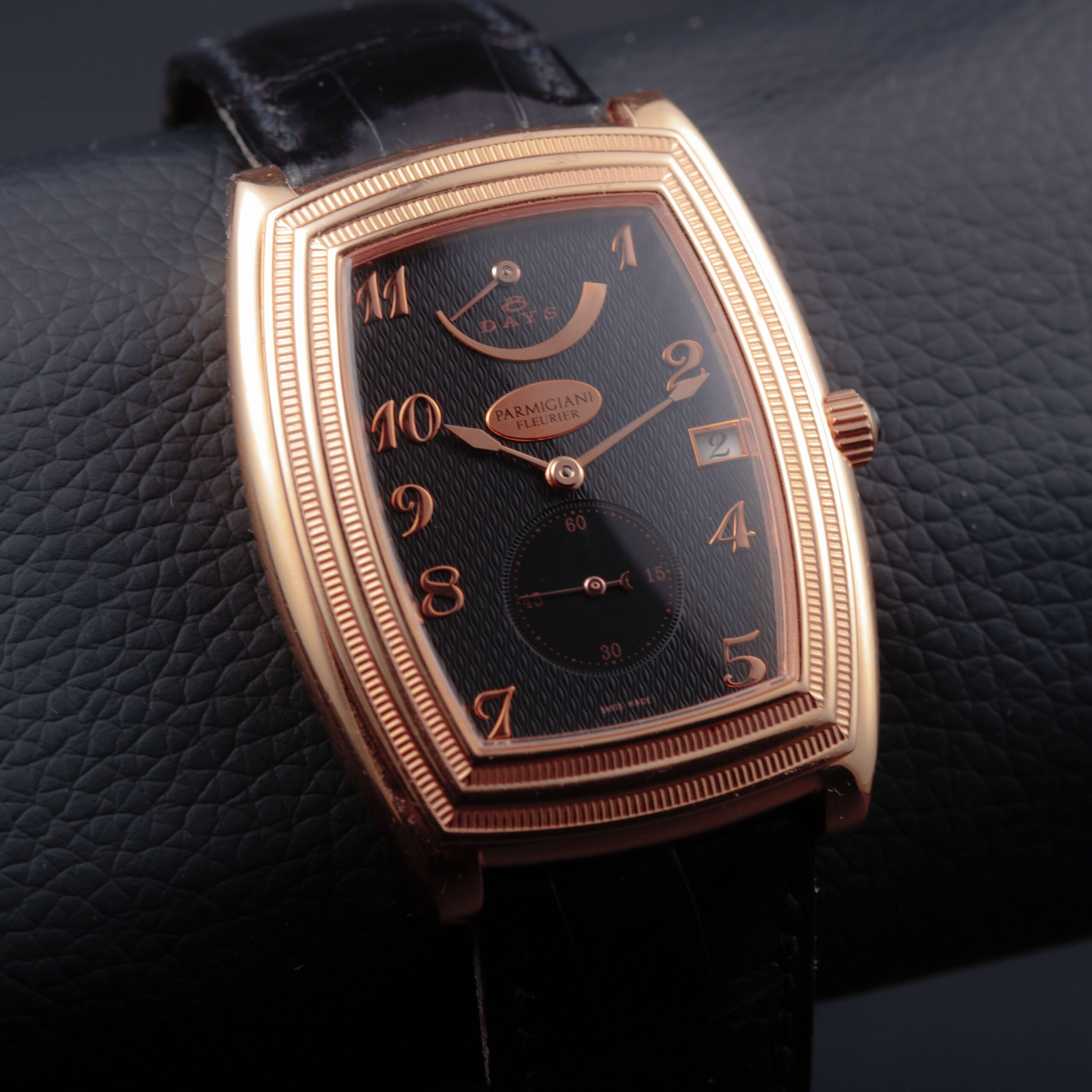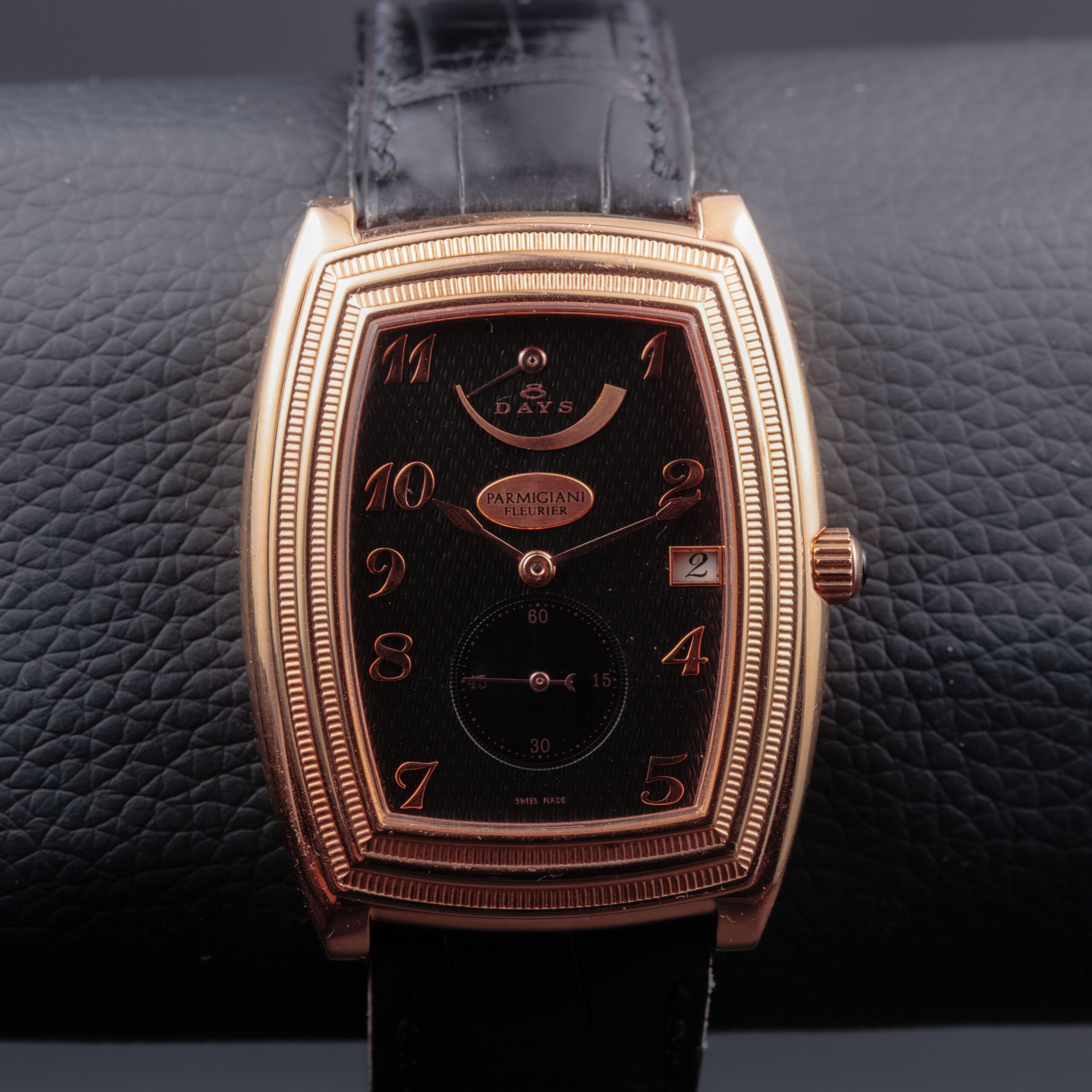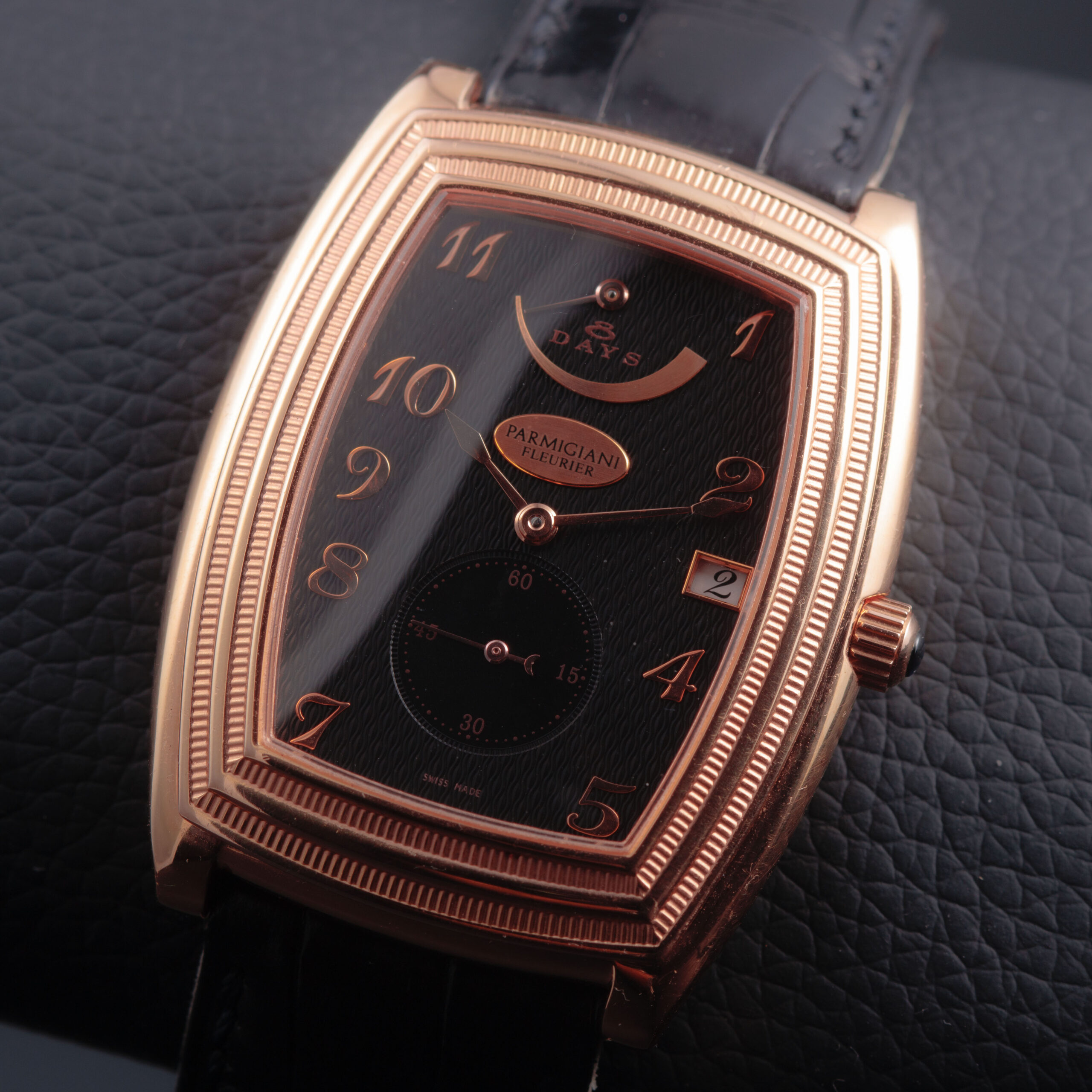 The sculptural tonneau-shaped case is crafted in warm 18-carat rose gold, displaying the refined architecture and elegant curvature characteristic of Parmigiani Fleurier’s early creations. The stepped bezel, finely fluted along its edges, adds depth and a strong neoclassical presence, while the polished surfaces and gently cambered profile emphasize the watch’s sophisticated proportions. The sapphire caseback reveals the movement in full, framed by a rose gold surround secured with visible screws, underscoring the technical and artisanal intent of the piece.