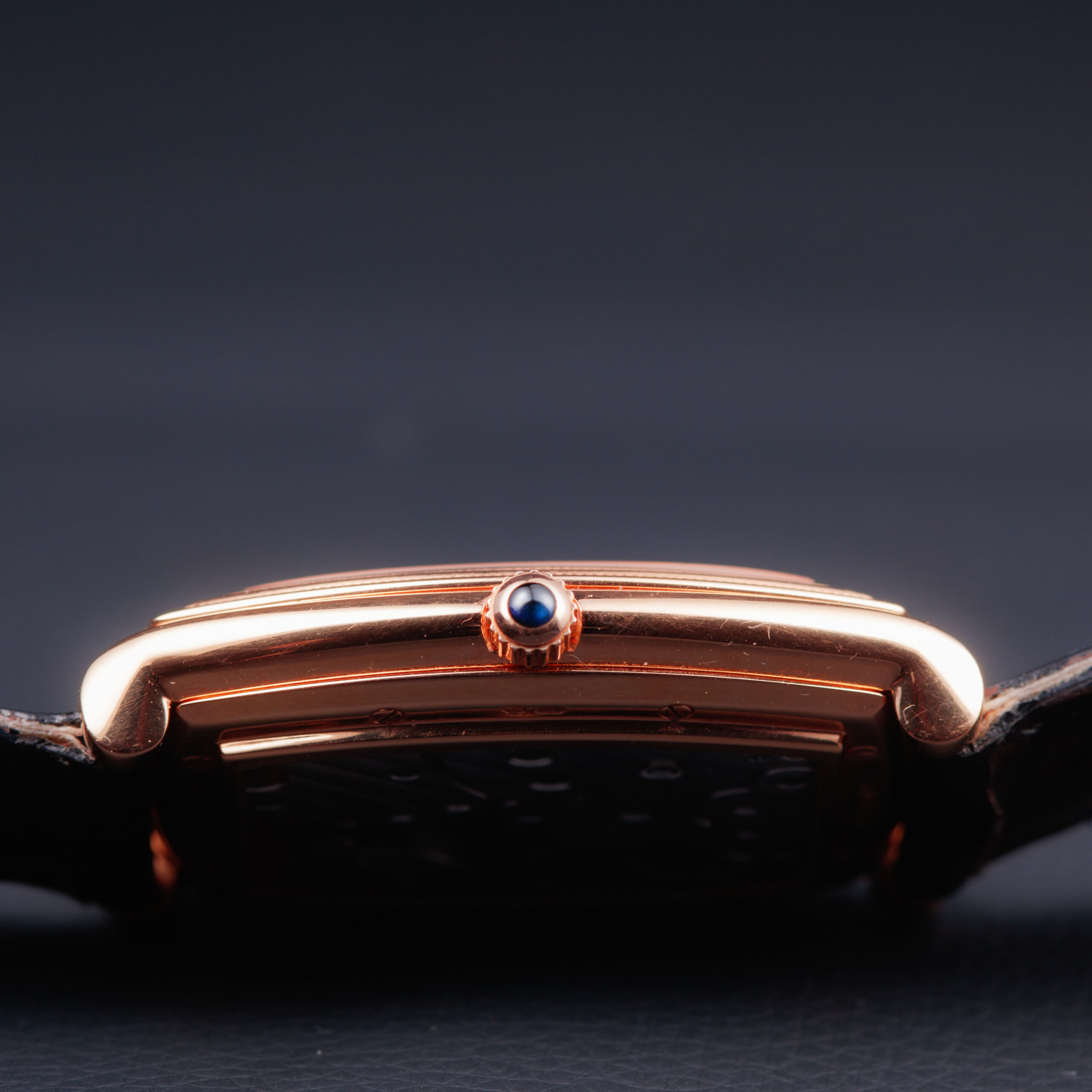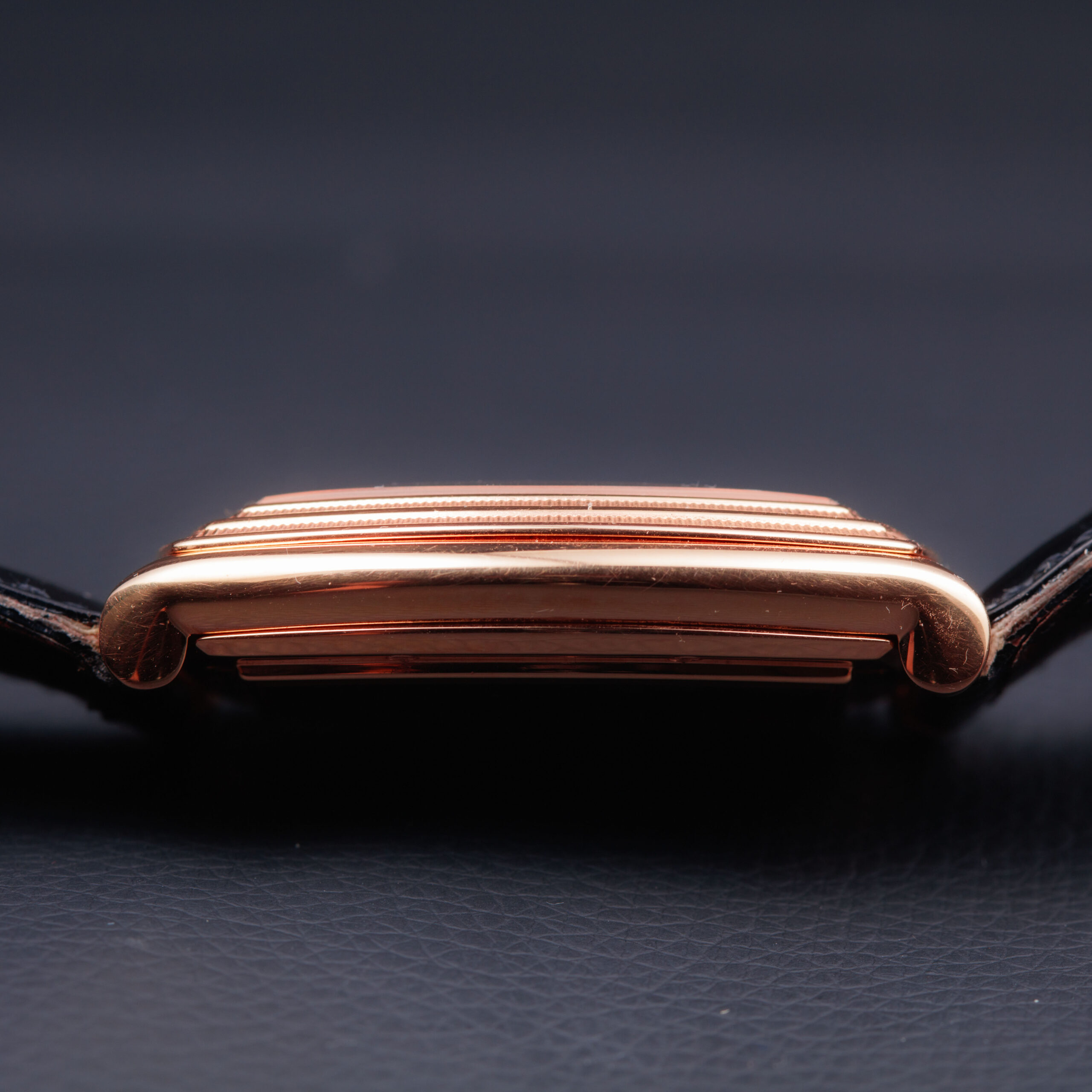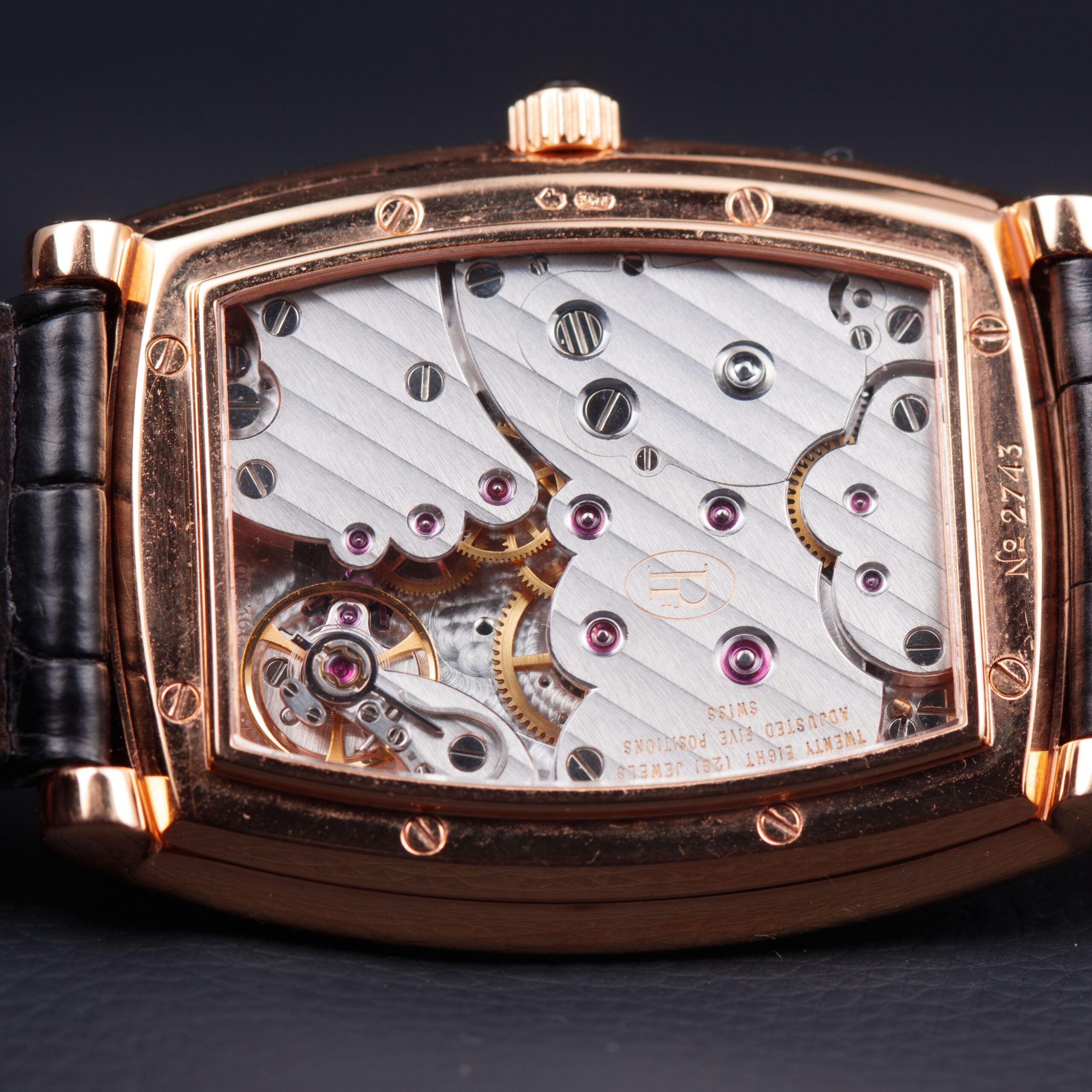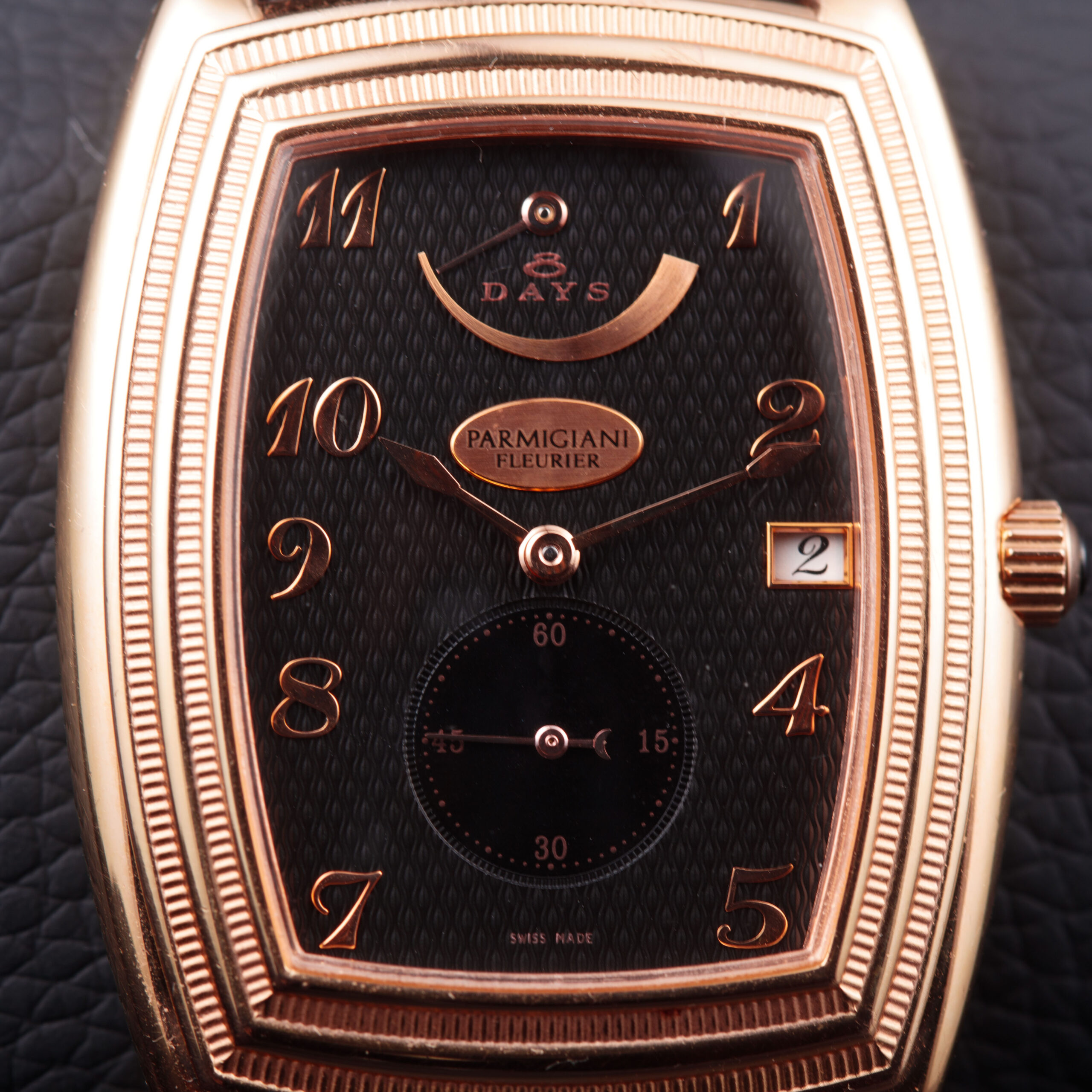 The sculptural tonneau-shaped case is crafted in warm 18-carat rose gold, displaying the refined architecture and elegant curvature characteristic of Parmigiani Fleurier’s early creations. The stepped bezel, finely fluted along its edges, adds depth and a strong neoclassical presence, while the polished surfaces and gently cambered profile emphasize the watch’s sophisticated proportions. The sapphire caseback reveals the movement in full, framed by a rose gold surround secured with visible screws, underscoring the technical and artisanal intent of the piece.