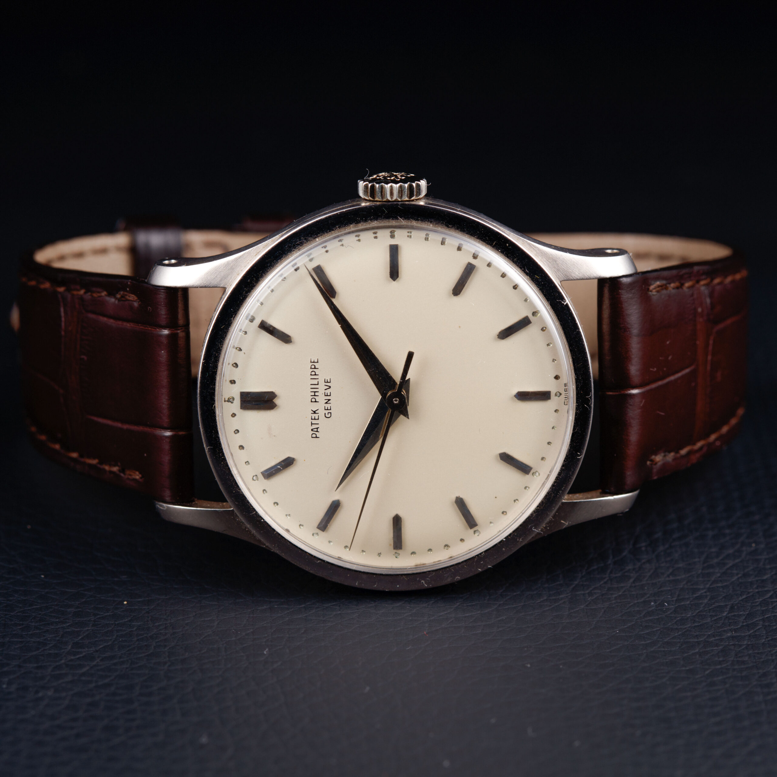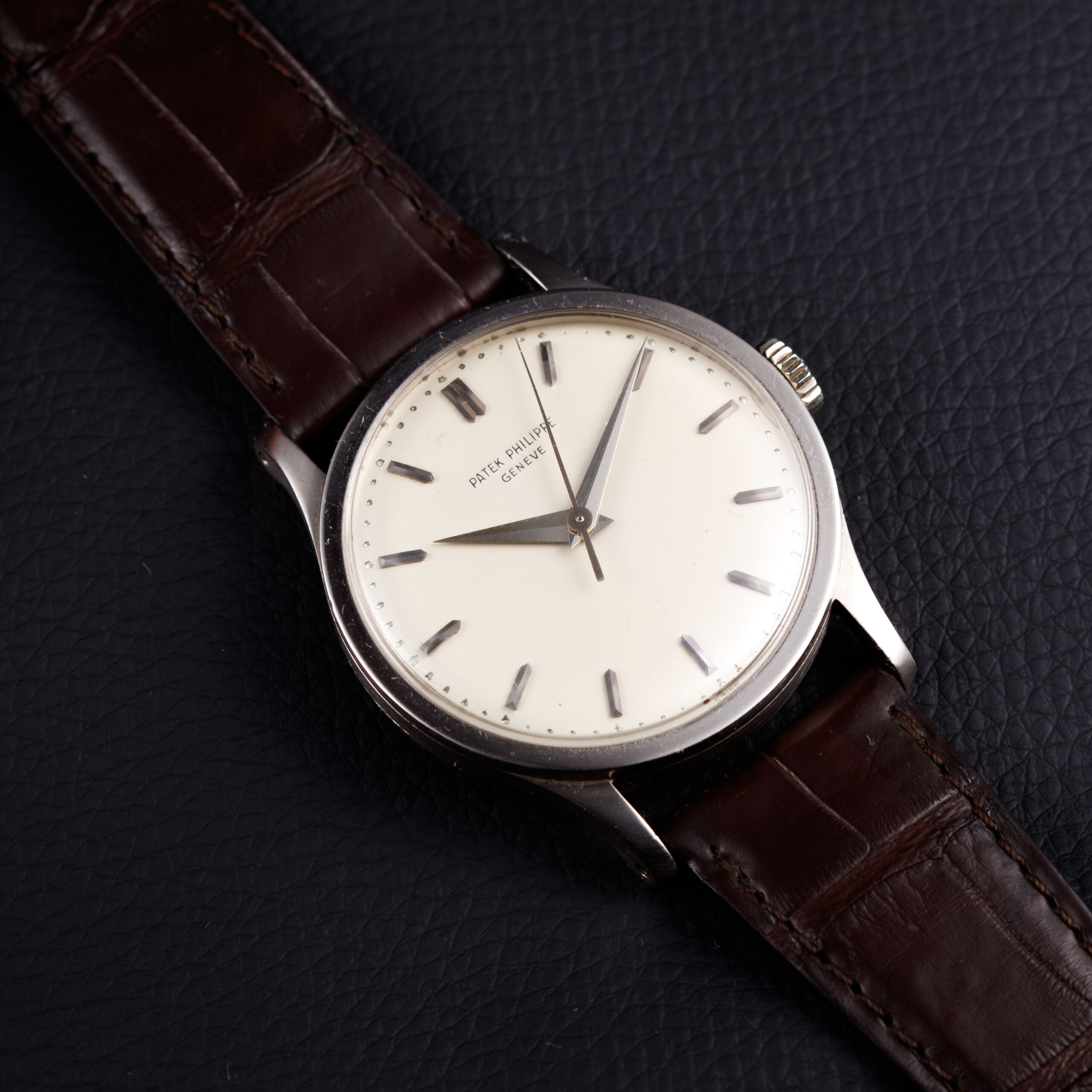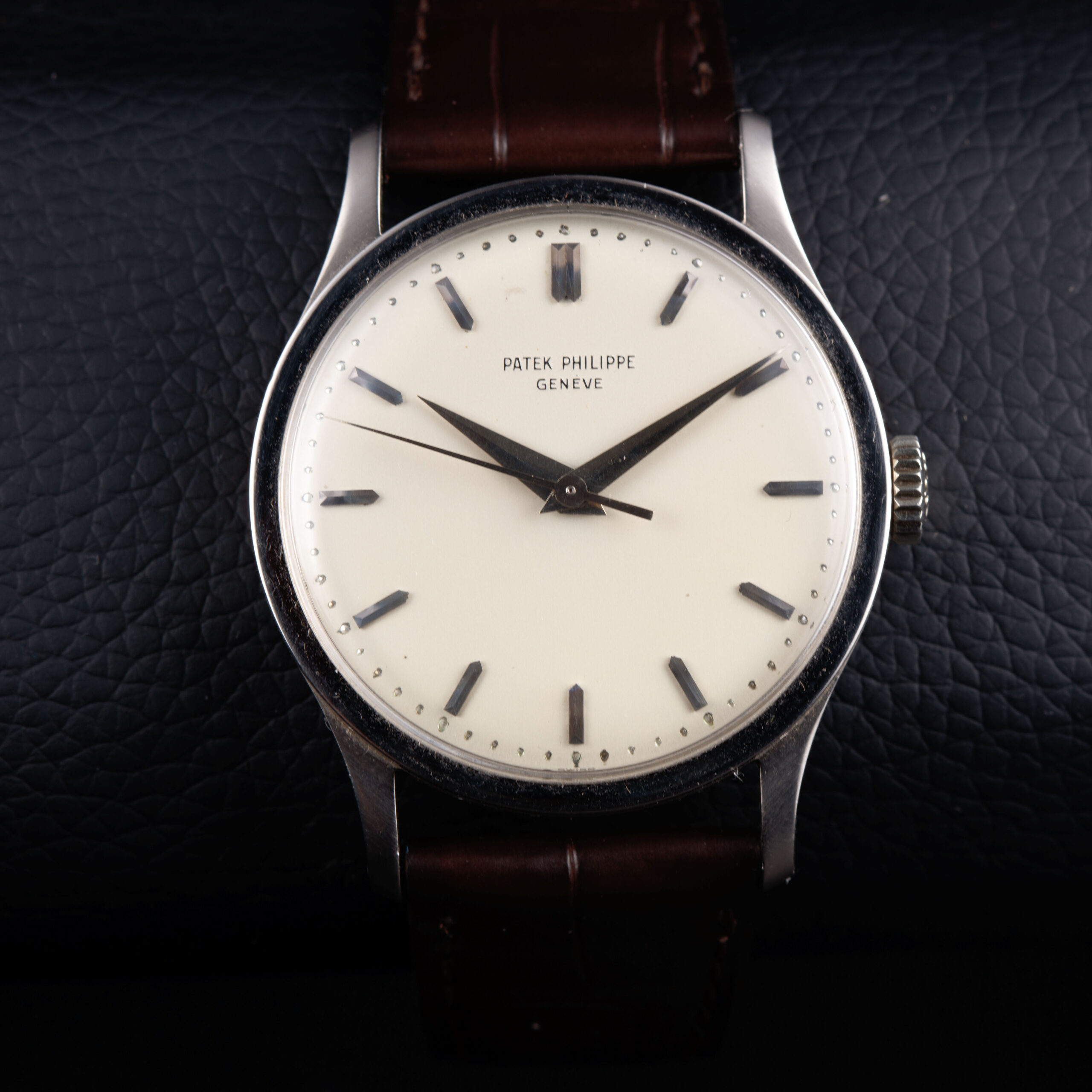 The original silvered dial displays a beautifully nuanced patina, confirmed by the Patek Philippe archives. Of special note is the rare central seconds configuration, an uncommon and highly desirable feature within the Calatrava lineage. The dial is further enhanced by elegant dauphine hands and applied baton hour markers in gold, harmoniously contrasted against the softly aged silver surface. A finely executed pearled minute track frames the dial, contributing both depth and refinement to the overall composition. The balance and clarity of the dial exemplify Patek Philippe’s understated yet exacting aesthetic standards of the period.