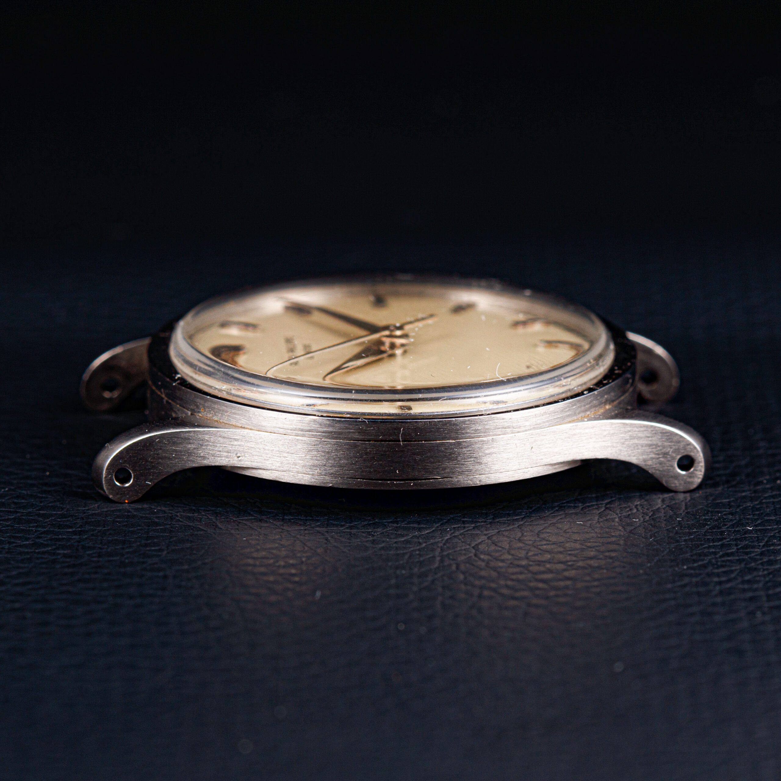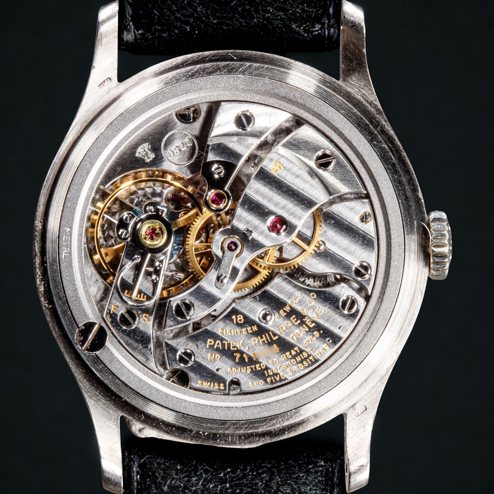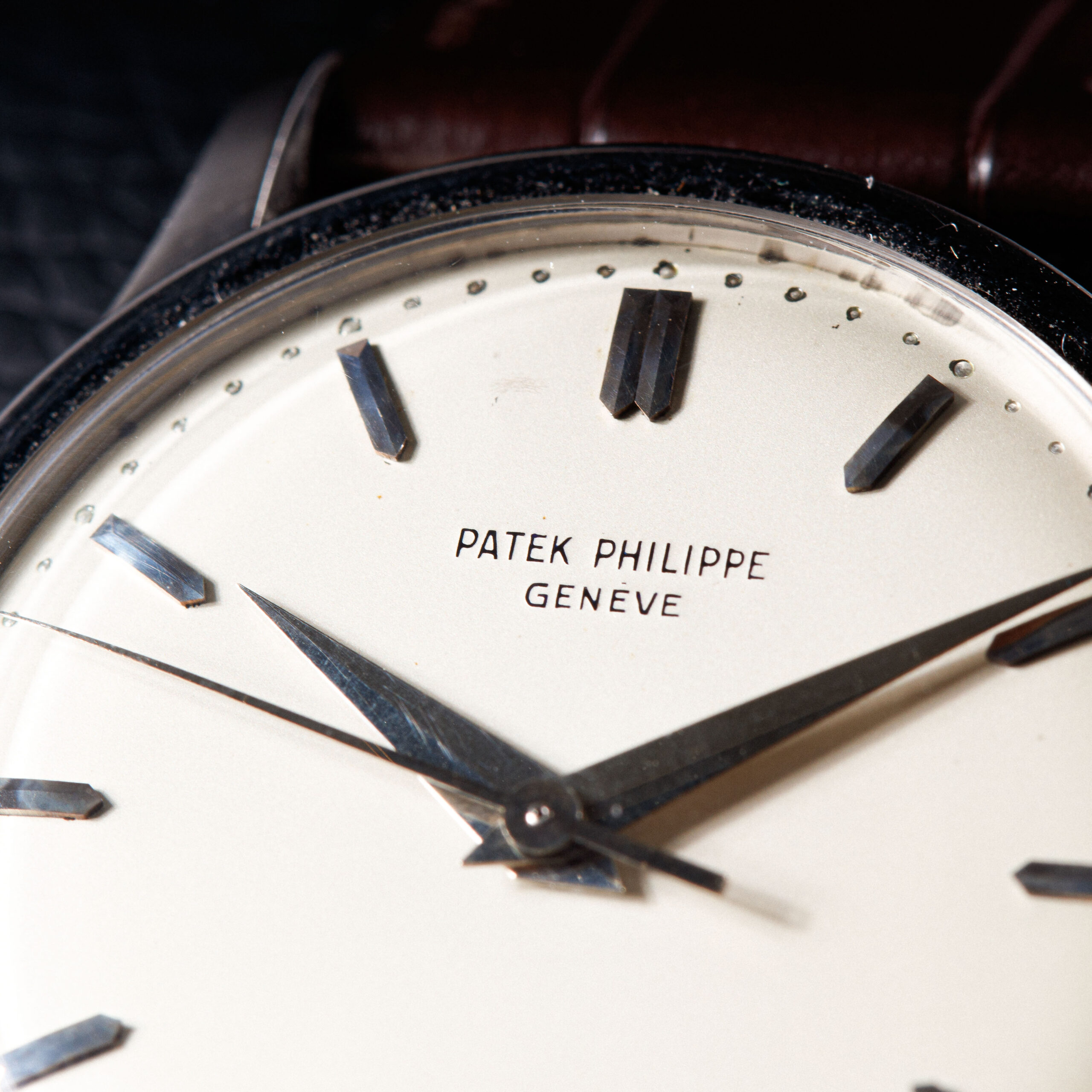The original silvered dial displays a beautifully nuanced patina, confirmed by the Patek Philippe archives. Of special note is the rare central seconds configuration, an uncommon and highly desirable feature within the Calatrava lineage. The dial is further enhanced by elegant dauphine hands and applied baton hour markers in gold, harmoniously contrasted against the softly aged silver surface. A finely executed pearled minute track frames the dial, contributing both depth and refinement to the overall composition. The balance and clarity of the dial exemplify Patek Philippe’s understated yet exacting aesthetic standards of the period.
