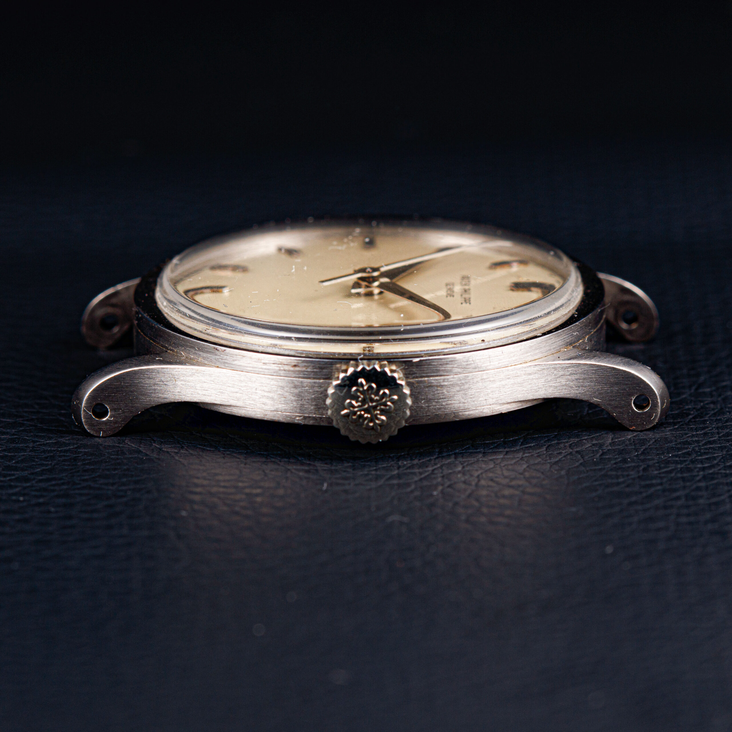 The white gold case is exceptionally attractive, preserved in a remarkably sharp state with only minimal signs of polishing. Crafted in 18-carat white gold, it features thick, sculptural lugs of a particularly distinctive and rare design, lending the watch a strong architectural presence. The snap-on caseback is characteristic of the reference, while the crown is correctly signed with the Patek Philippe emblem. All hallmarks remain crisp and clearly legible, underscoring the integrity and originality of the case.