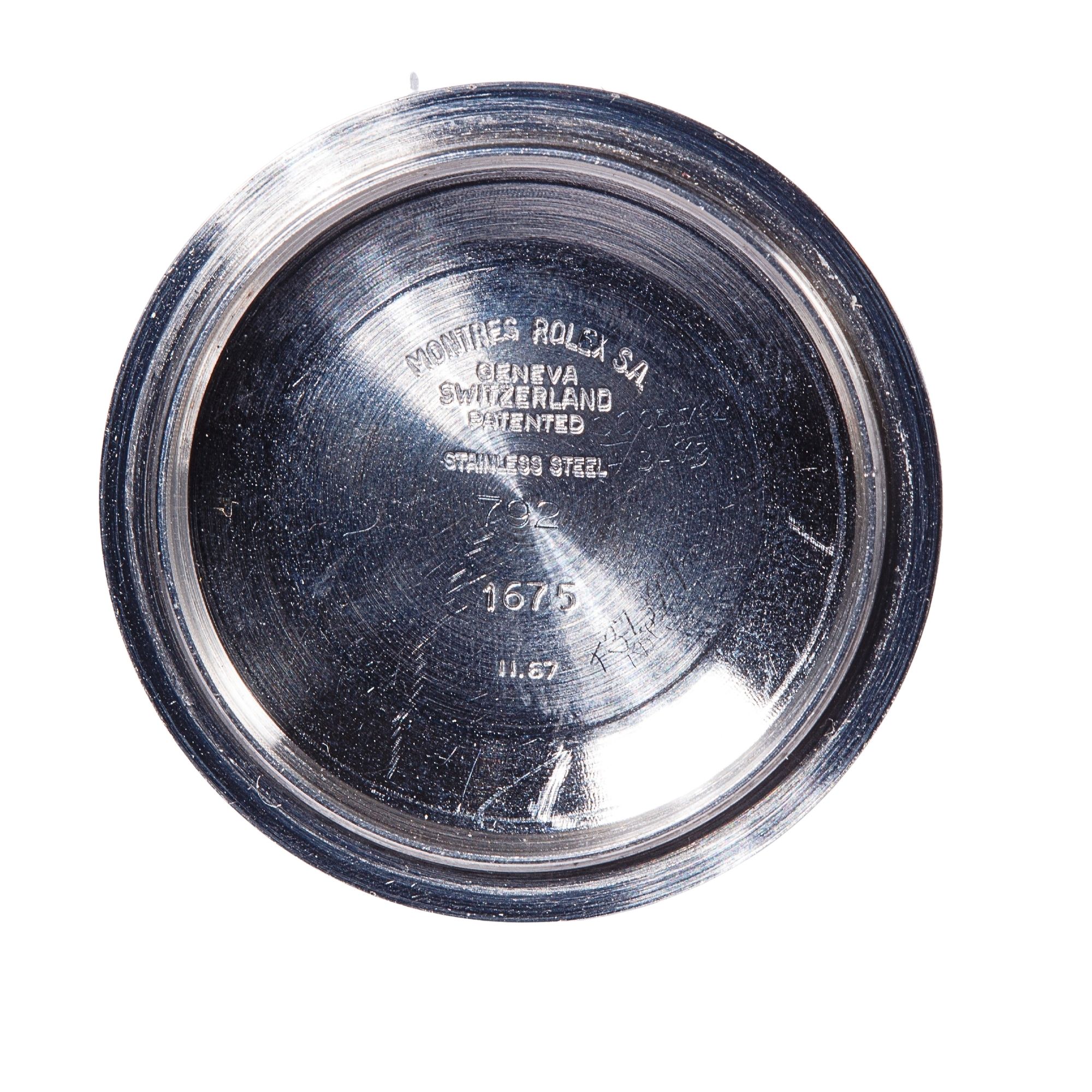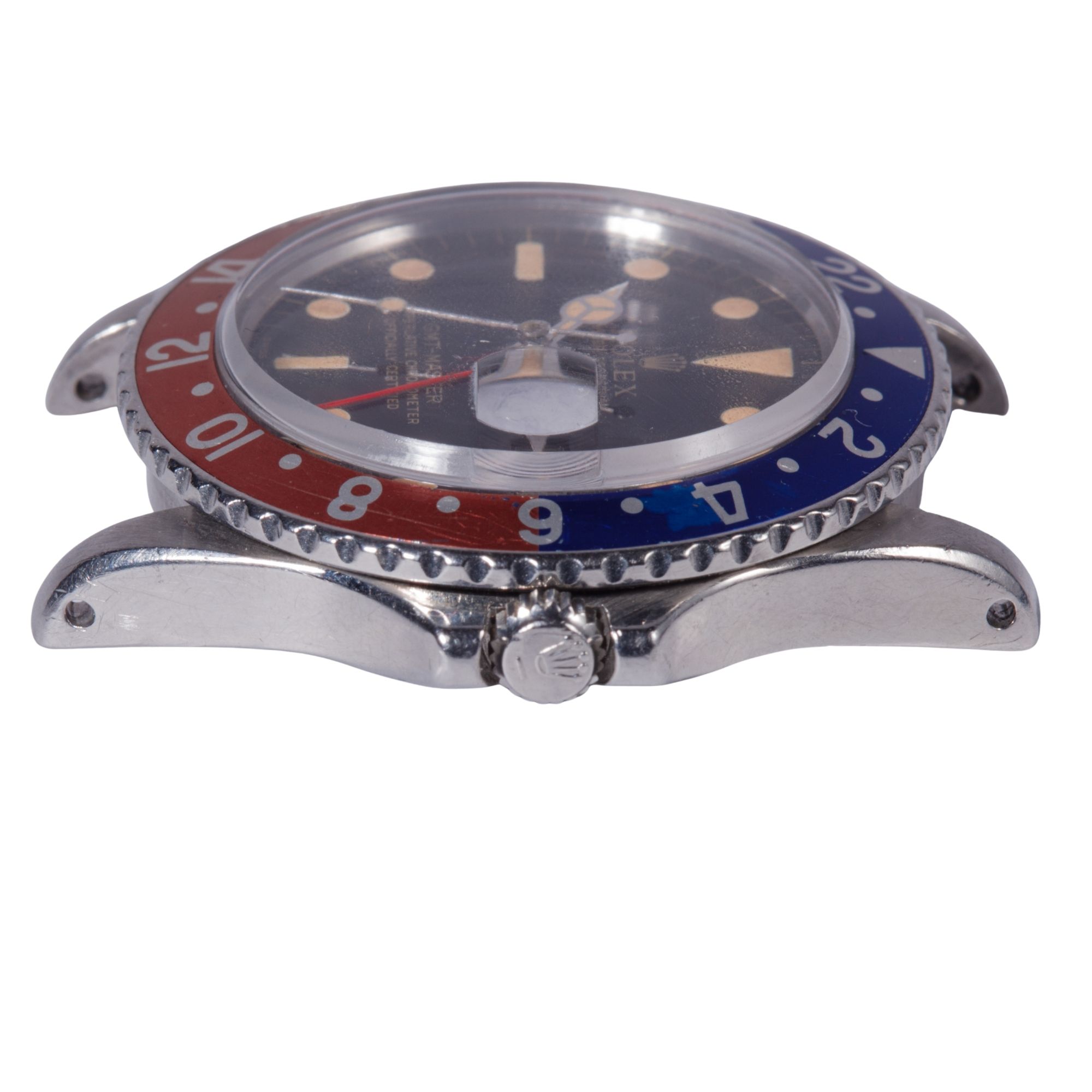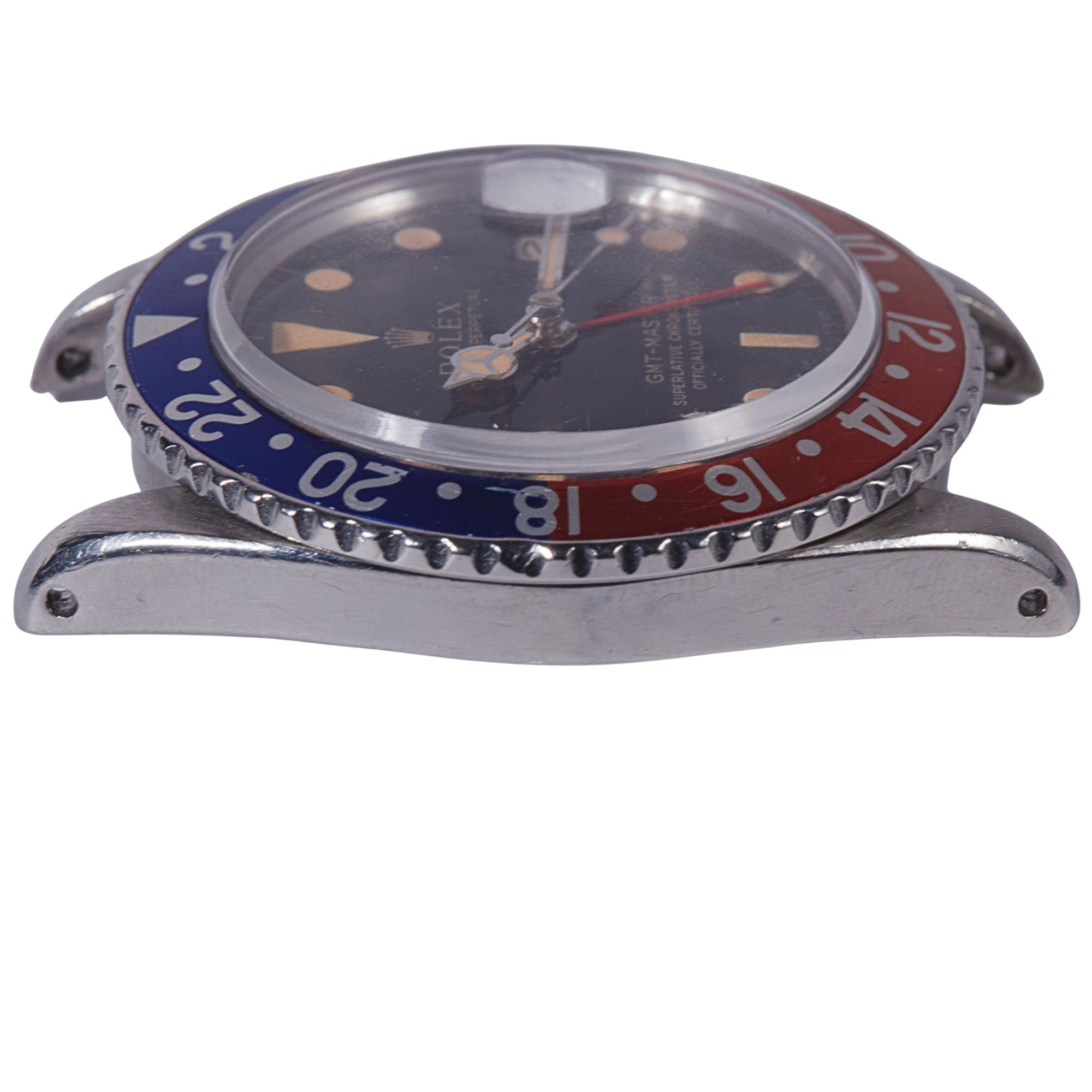 The stainless steel Oyster case is preserved in exceptionally strong condition, retaining impressive thickness and structural definition. The lugs remain notably full, displaying sharp, well-articulated geometry and beautifully preserved bevels, features that are increasingly uncommon among vintage GMT-Master examples. The case shows only minimal signs of polishing, allowing the original factory proportions and finishing transitions to remain clearly legible. Surface wear is limited to light and honest signs of use, with no significant impacts, deep scratches, or structural alterations. Of particular interest, the caseback is engraved by Rolex and features internal double numbering, a construction detail most often associated with special-order or military-issued pieces, including certain COMEX and other highly specialised Rolex productions. This uncommon manufacturing characteristic adds a significant layer of historical and technical intrigue to the watch and contributes to its collectability. Overall, the case represents a remarkably well-preserved example that retains the robust presence and manufacturing integrity expected from early professional Rolex tool watches.