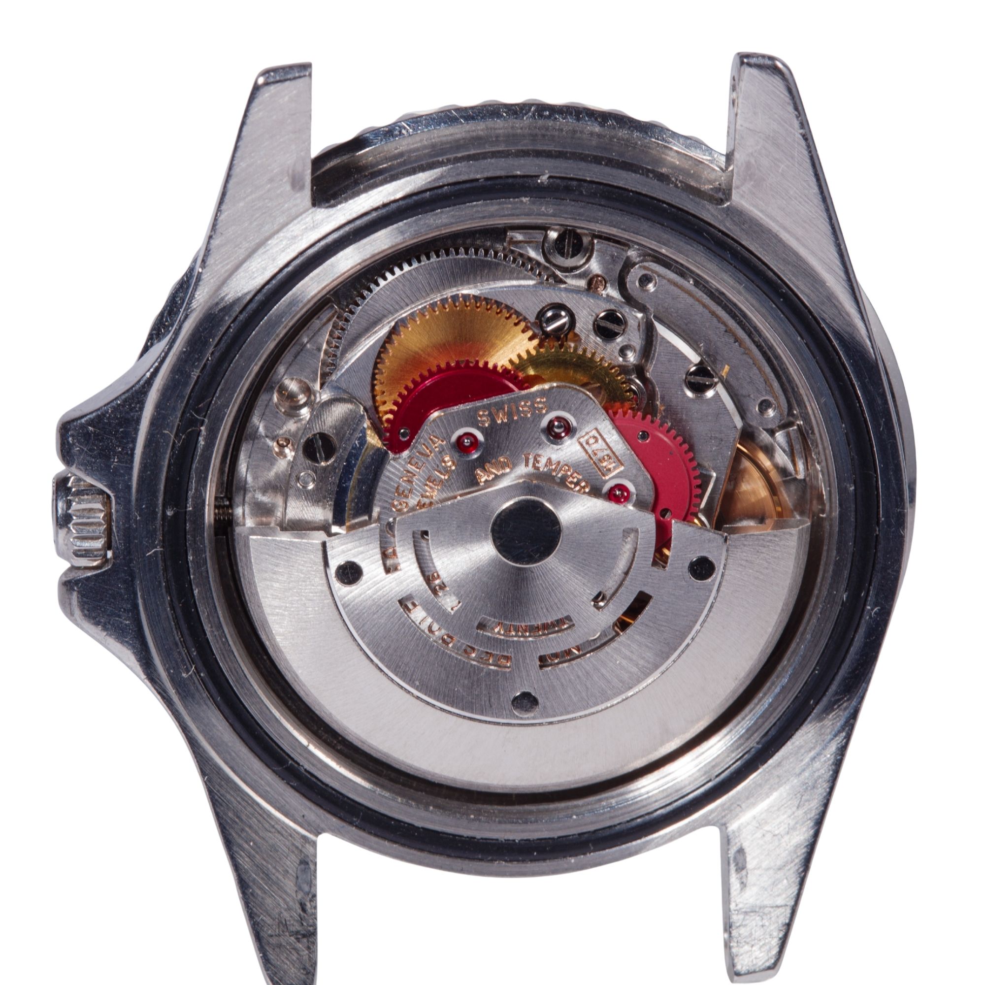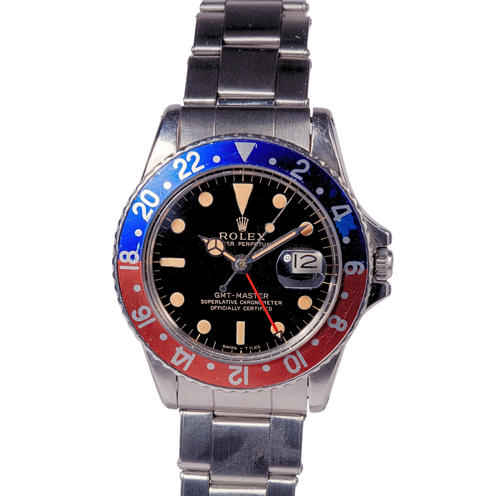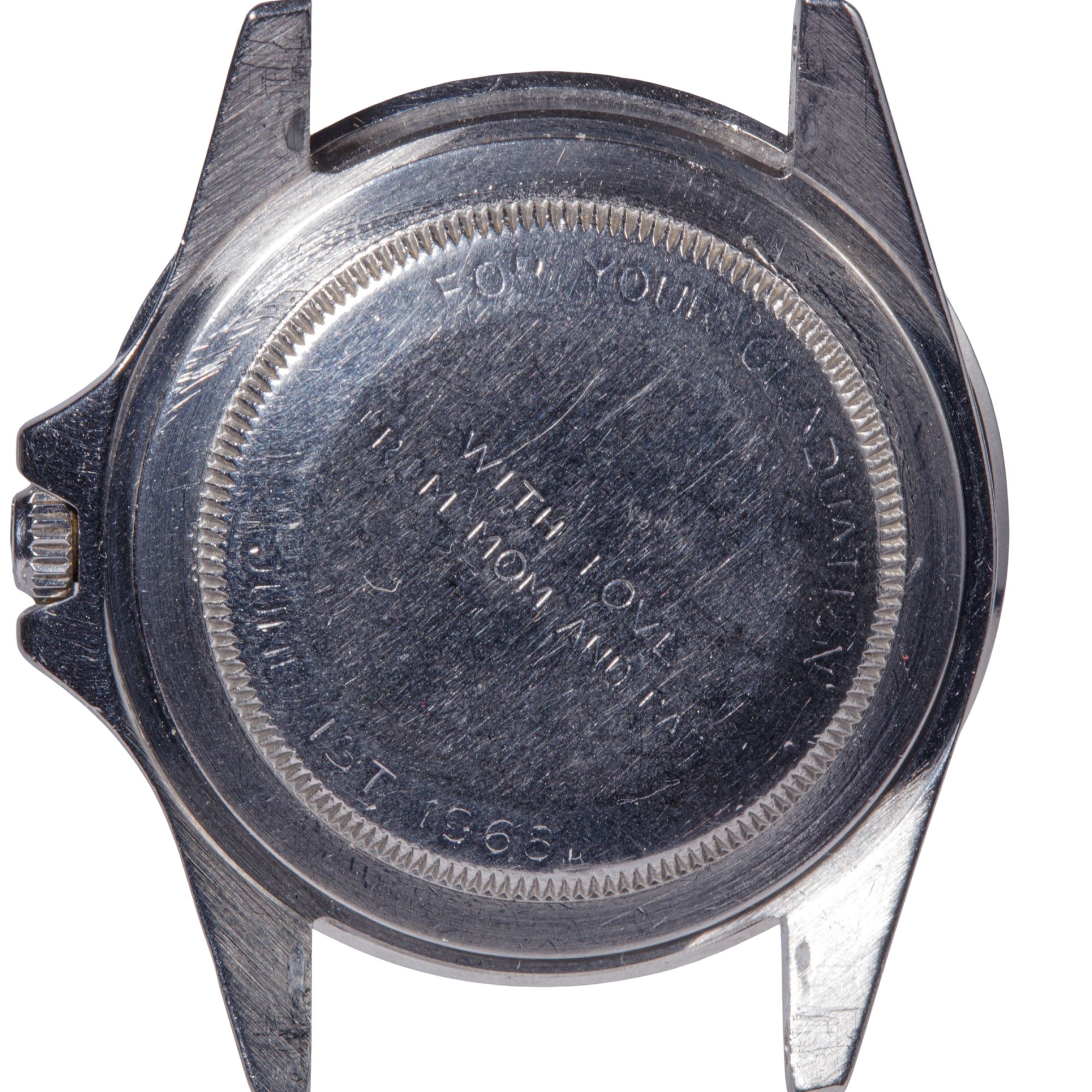 The stainless steel Oyster case is preserved in exceptionally strong condition, retaining impressive thickness and structural definition. The lugs remain notably full, displaying sharp, well-articulated geometry and beautifully preserved bevels, features that are increasingly uncommon among vintage GMT-Master examples. The case shows only minimal signs of polishing, allowing the original factory proportions and finishing transitions to remain clearly legible. Surface wear is limited to light and honest signs of use, with no significant impacts, deep scratches, or structural alterations. Of particular interest, the caseback is engraved by Rolex and features internal double numbering, a construction detail most often associated with special-order or military-issued pieces, including certain COMEX and other highly specialised Rolex productions. This uncommon manufacturing characteristic adds a significant layer of historical and technical intrigue to the watch and contributes to its collectability. Overall, the case represents a remarkably well-preserved example that retains the robust presence and manufacturing integrity expected from early professional Rolex tool watches.