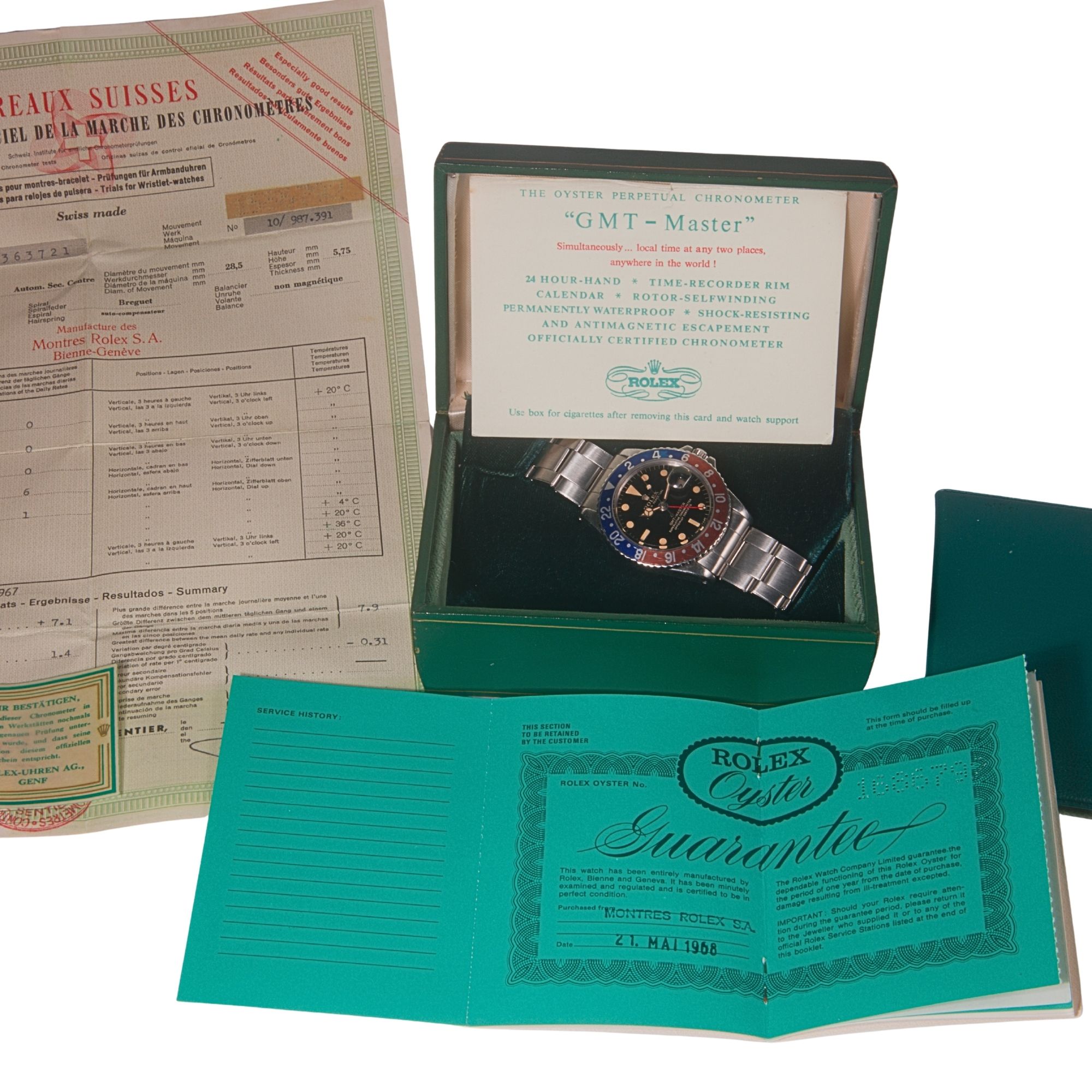 Accessories: Complete original punched warranty papers, original punched chronometer certification documents, original presentation box. The survival of a fully complete accessory set, including period punched documentation and chronometer certificates, significantly enhances the watch’s provenance, historical credibility, and collector desirability.