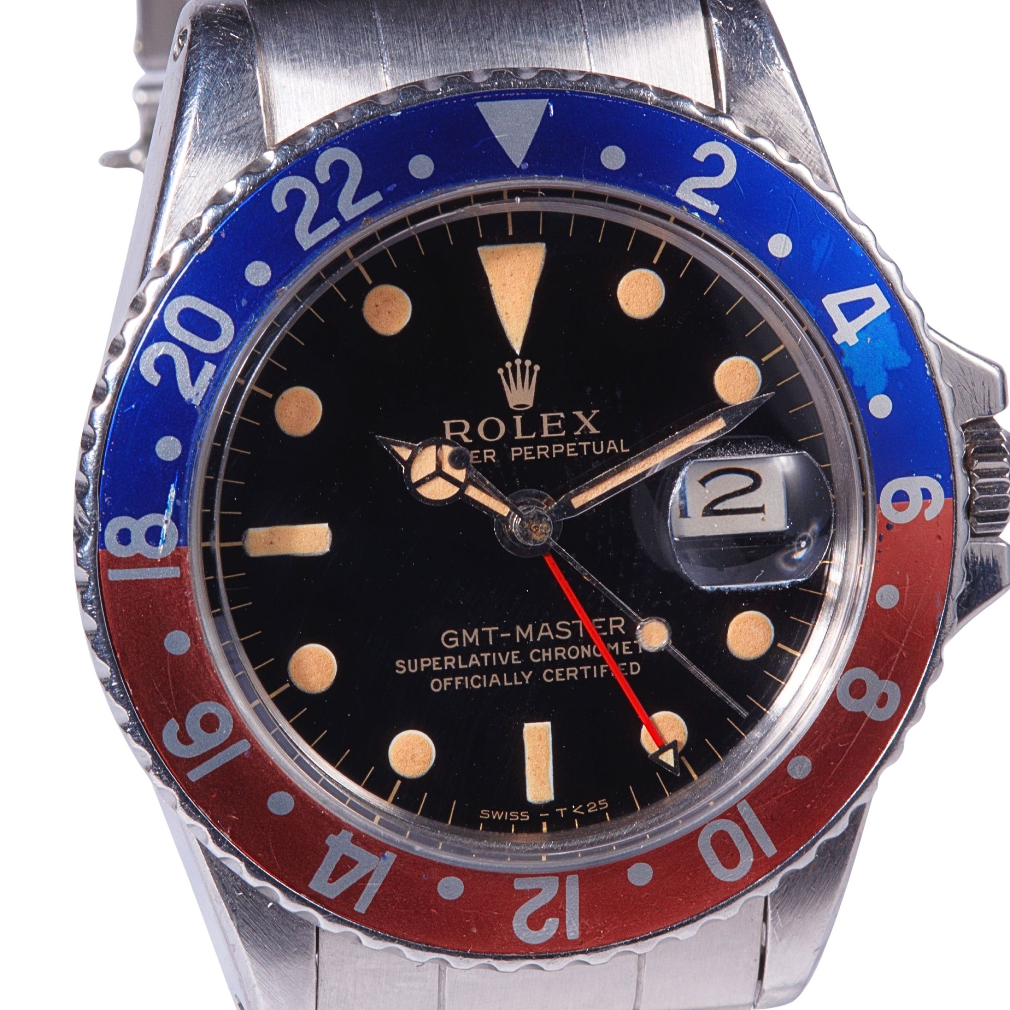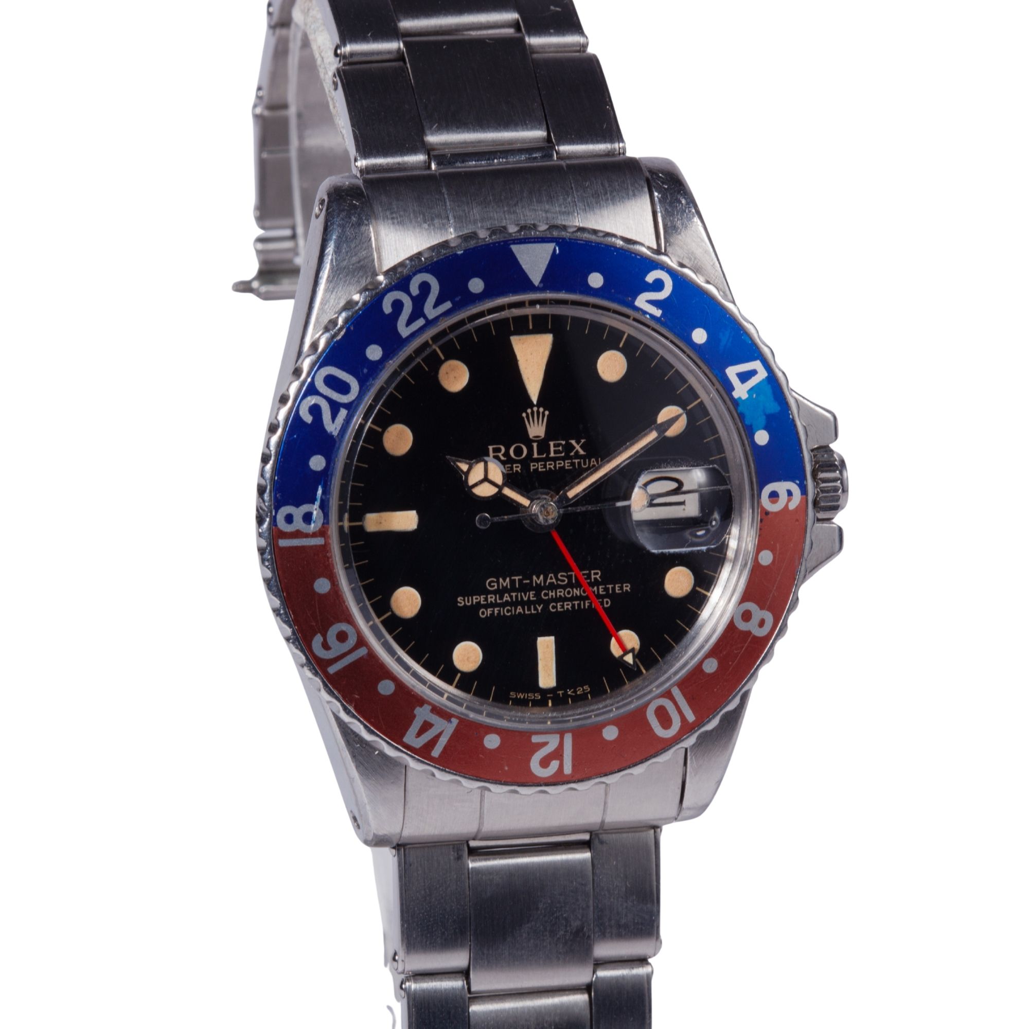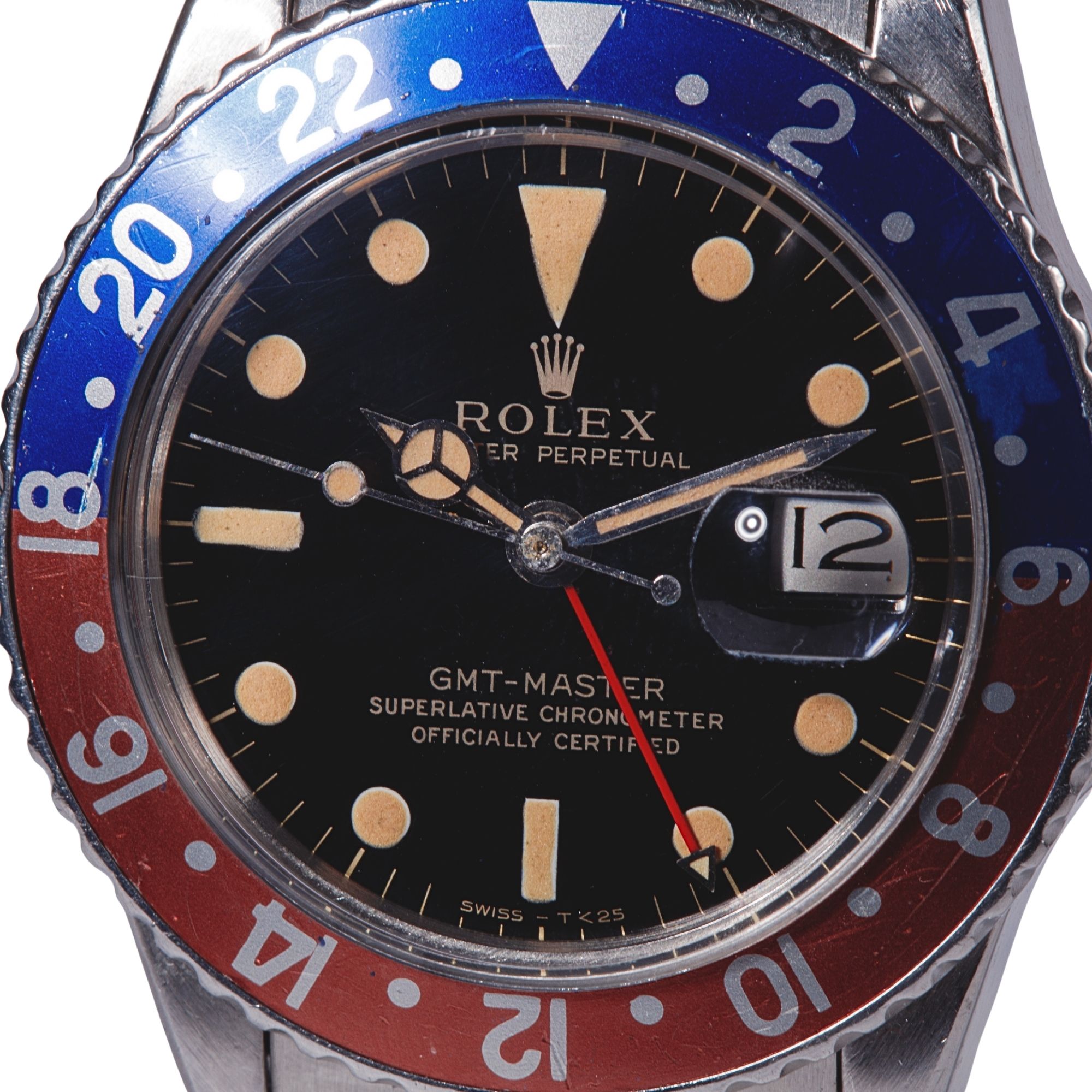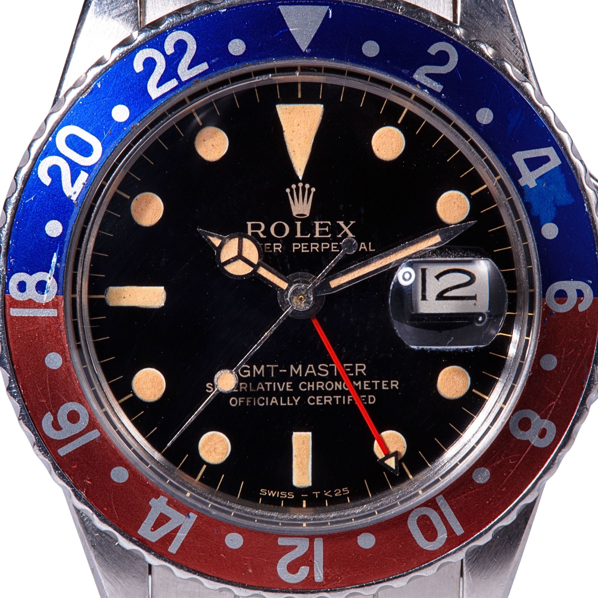 Outstanding original black gilt dial preserved in exceptional condition. The glossy lacquer surface remains beautifully intact, maintaining strong visual depth and reflective clarity. The gilt printing is crisp and richly toned, illustrating the refined galvanic dial manufacturing techniques employed by Rolex during the early 1960s. The applied hour markers retain their original tritium luminous material, which has developed an attractive and consistent patina, evolving into a warm and desirable aged tone highly prized by collectors. The original hands remain perfectly matched to the dial, displaying harmonious ageing and uniform luminous colouration. The dial is free from scratches, spotting, or restoration, preserving an exceptional level of originality and aesthetic integrity rarely encountered on gilt dial GMT-Master references.