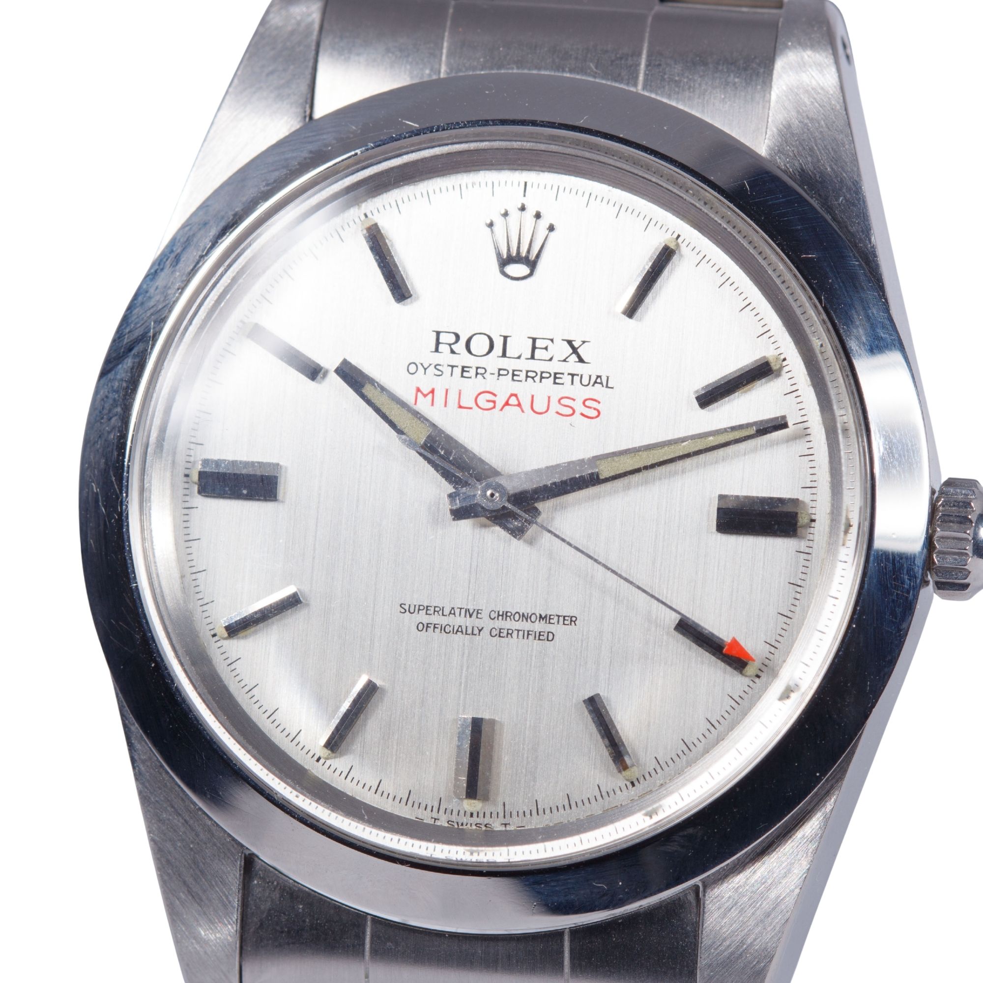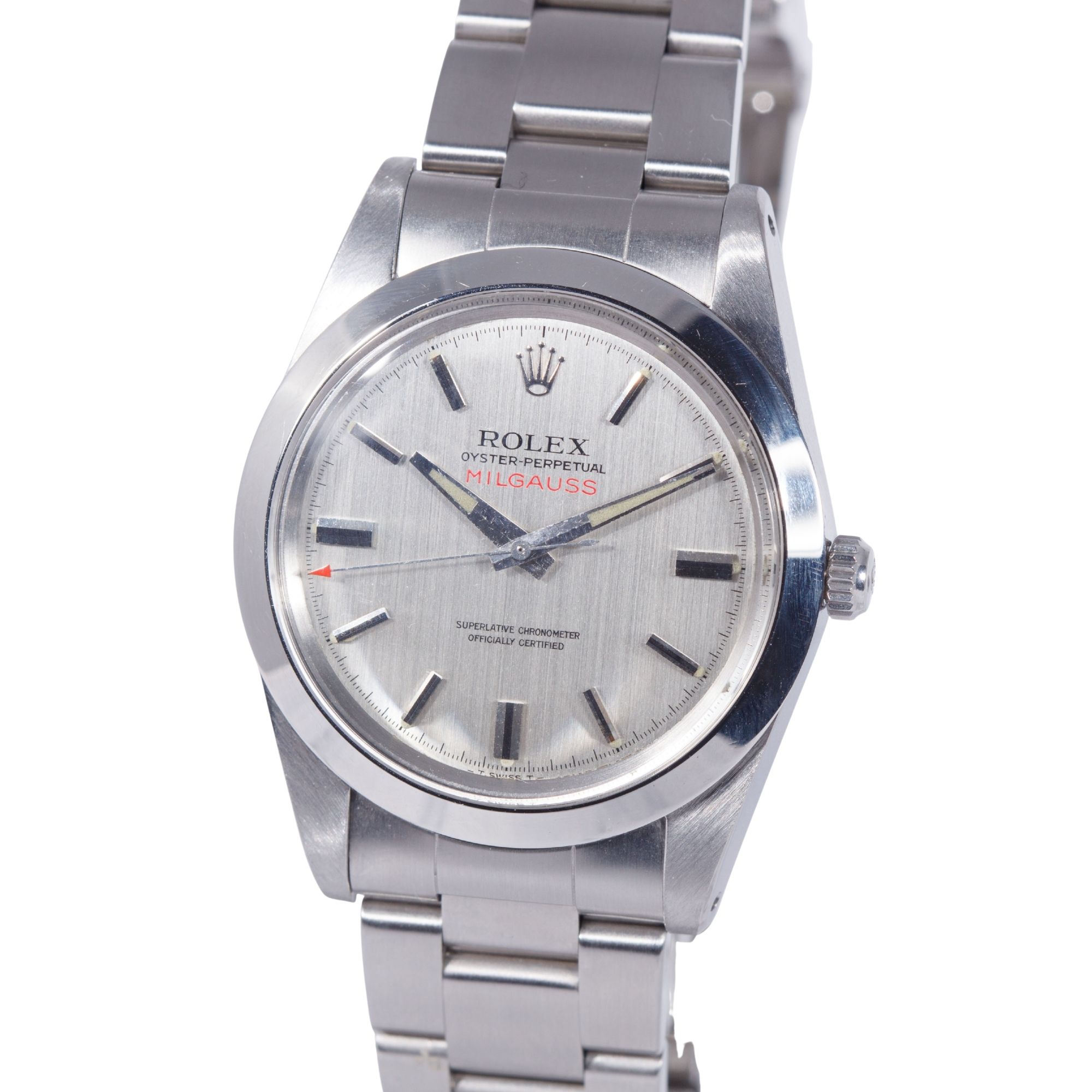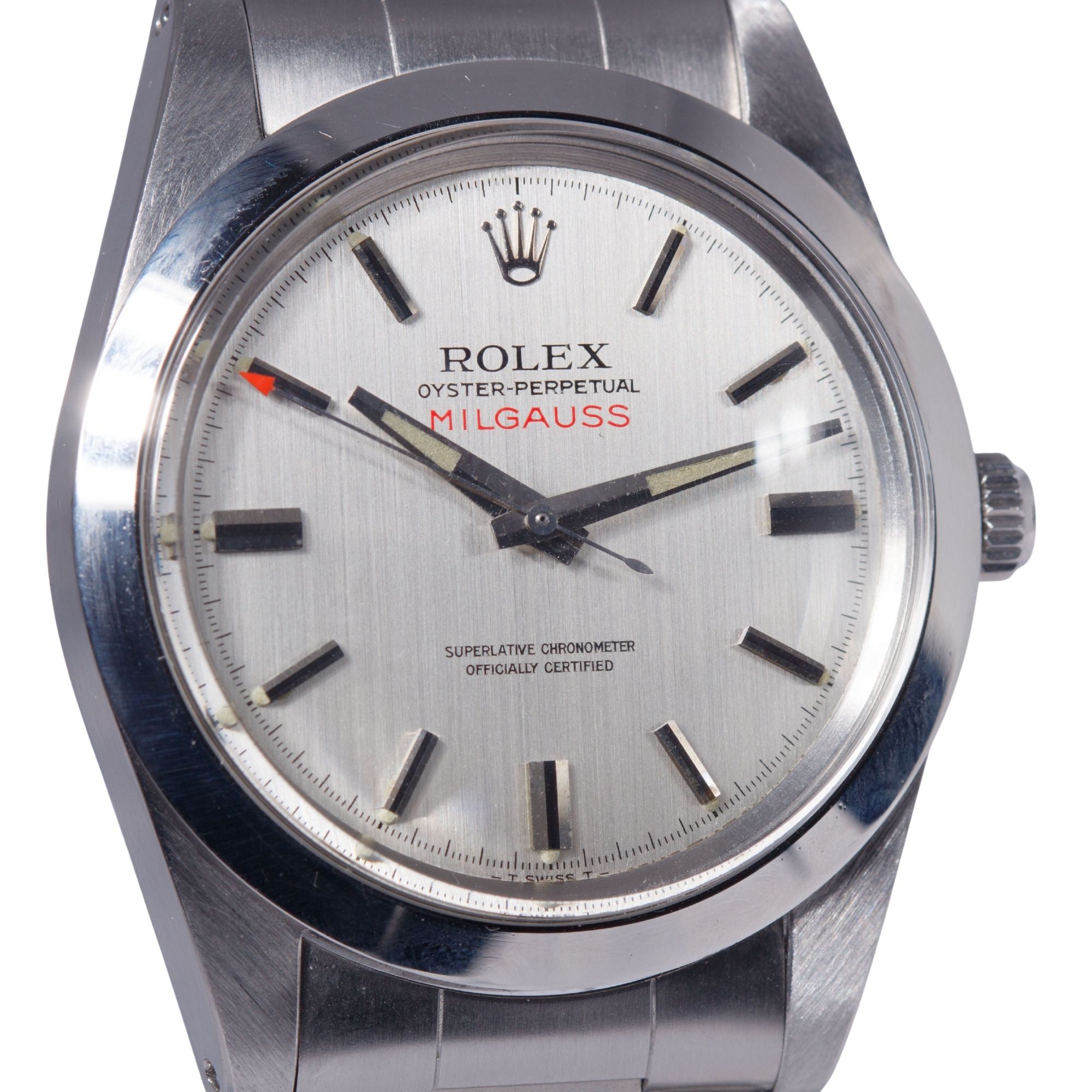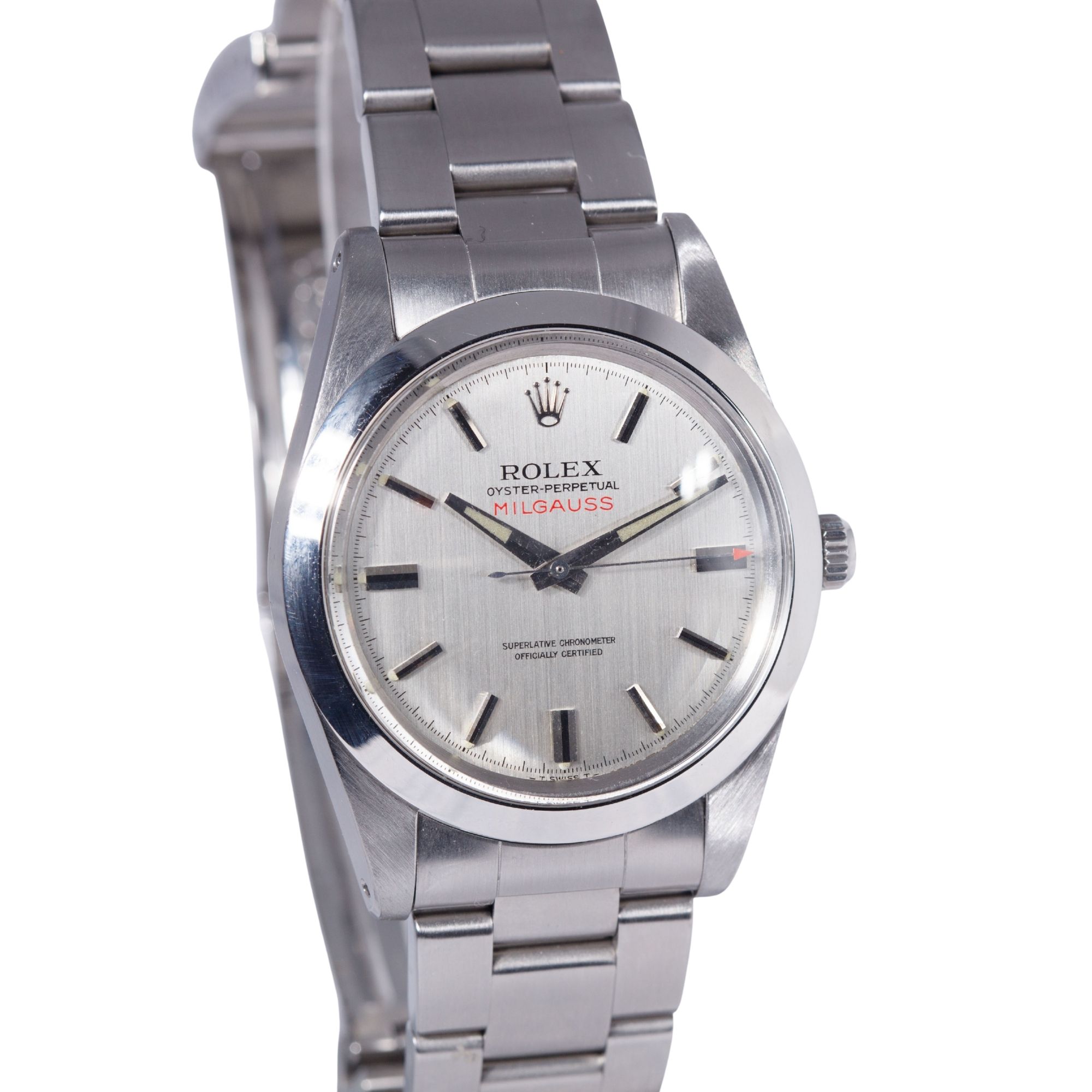 The stainless steel case is preserved in outstanding condition, retaining sharp, well-defined edges and proportions consistent with factory specifications. The original satin finishing remains clearly visible, showing no evidence of excessive polishing — a notably rare characteristic for Milgauss examples dating from the 1970s.